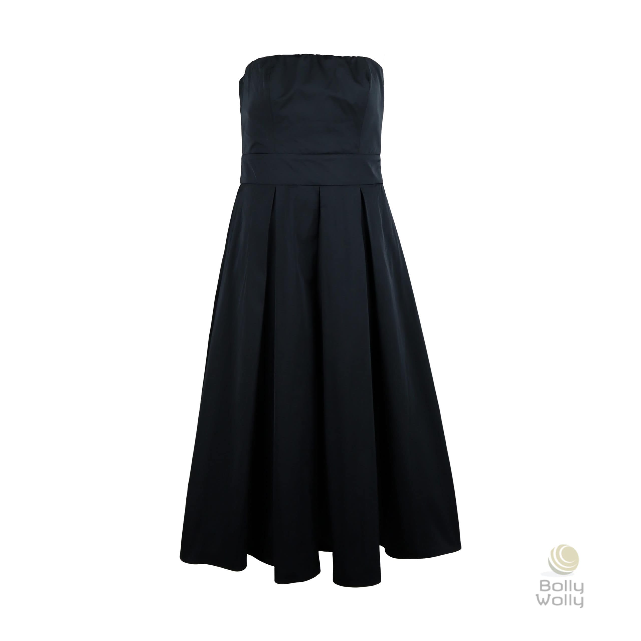 Strapless kleedje van Twinset. Deze zwarte bustierjurk heeft een lijfje van neopreen aan de binnenzijde en is gemaakt van een zwarte satijnen stof. De jurk heeft een geplooide rok, verborgen ritssluiting aan de achterzijde, twee steekzakken en valt op de knie. De jurk heeft twee losse spaghetti bandjes, die je aan de jurk kunt bevestigen.