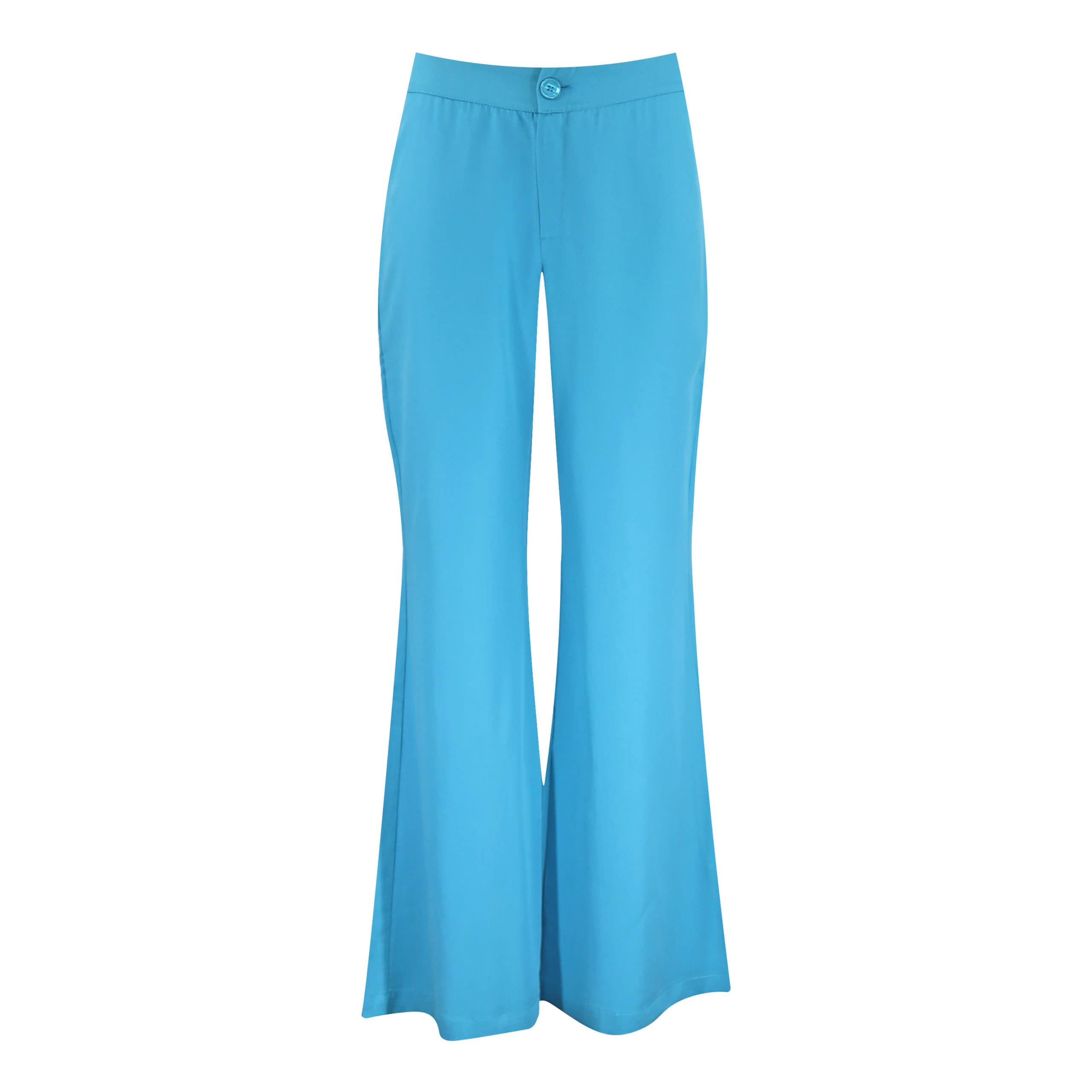 Flared pantalon van Verysimple in turquoise. Deze pantalon heeft een hoge taille met flared broekspijpen. De broek sluit met een knoop- en ritssluiting, heeft aan de achterzijde een elastische taille en heeft twee steekzakken en twee achterzakken.
