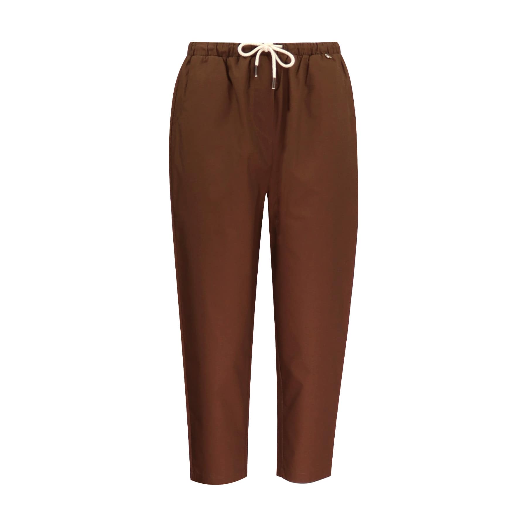 Bruine driekwart pantalon van Verysimple. Deze relaxte broek heeft een hoge taille, losvallende pasvorm en toelopende broekspijpen. De pantalon heeft een elastische taille met trekkoord en twee steekzakken.
