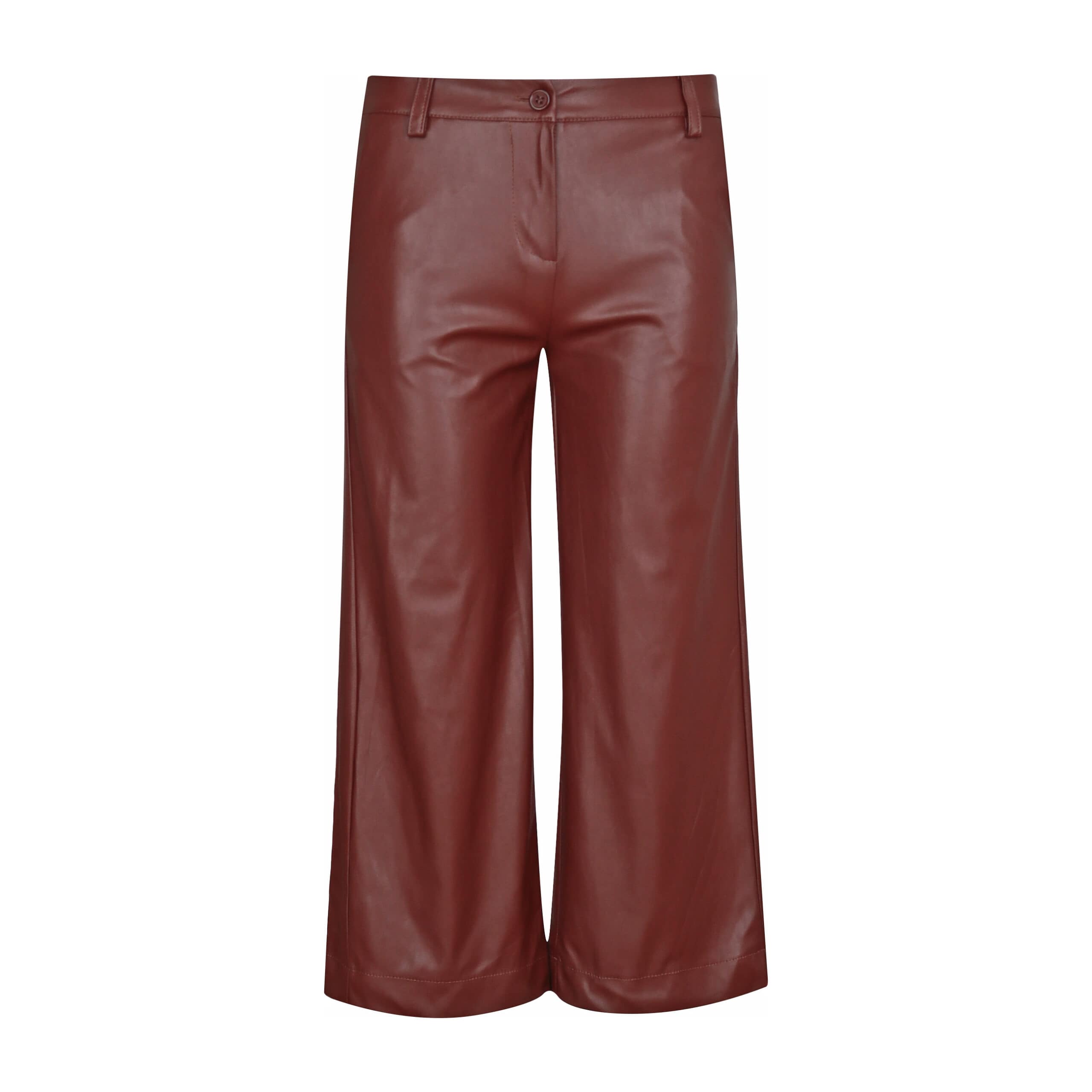 Bruine faux leather pantalon van Verysimple. Deze korte culotte broek heeft een normale taille met rechte wijde broekspijpen. De cropped pantalon sluit met een knoop- en ritssluiting en heeft twee steekzakken.