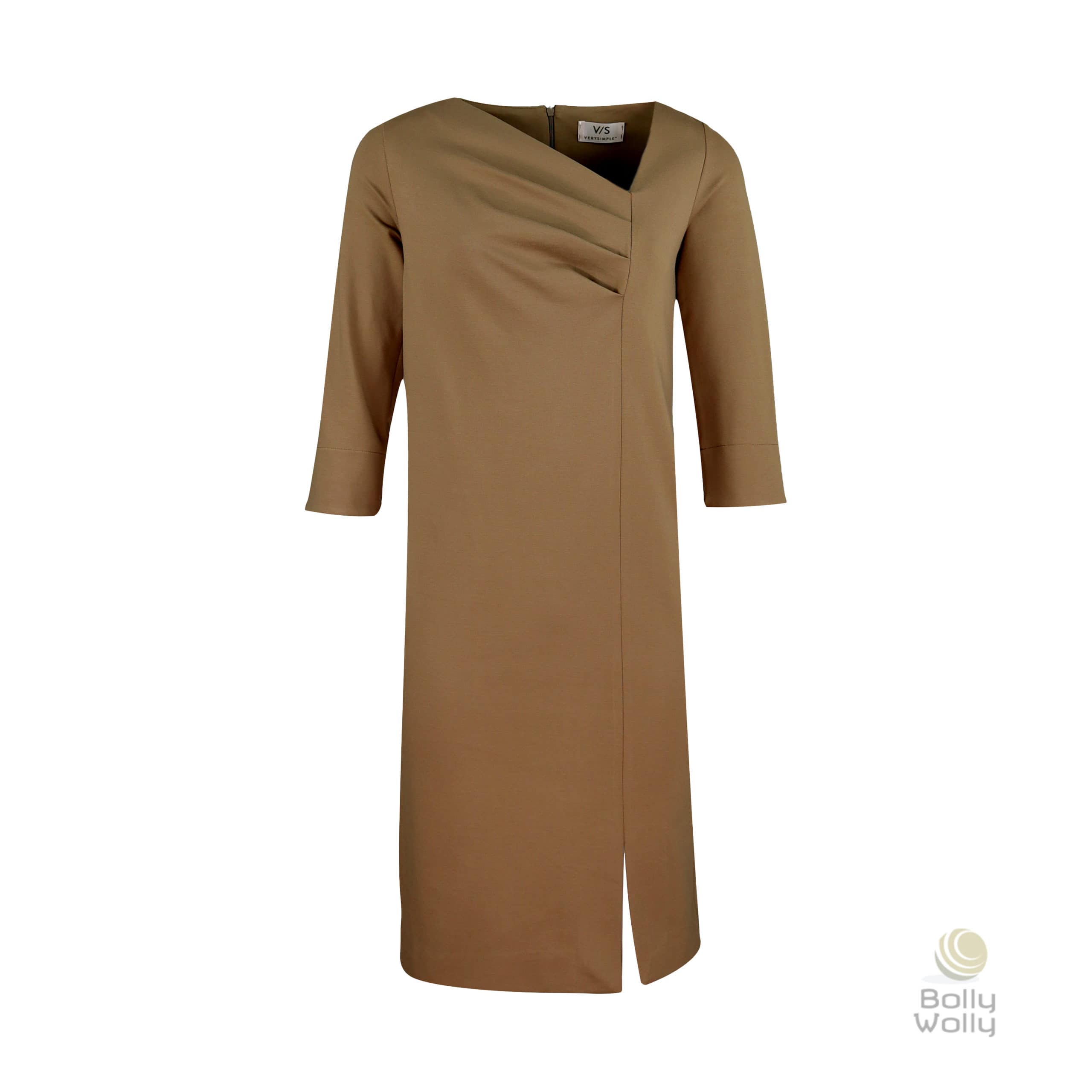 Bruin kleedje van Verysimple. Deze jurk is gemaakt van stevige bruine stretch stof, heeft een rechte pasvorm en valt op de knie. De jurk heeft een geplooide hals, driekwart mouwen, verborgen ritssluiting aan de achterzijde en een split aan de voorzijde.