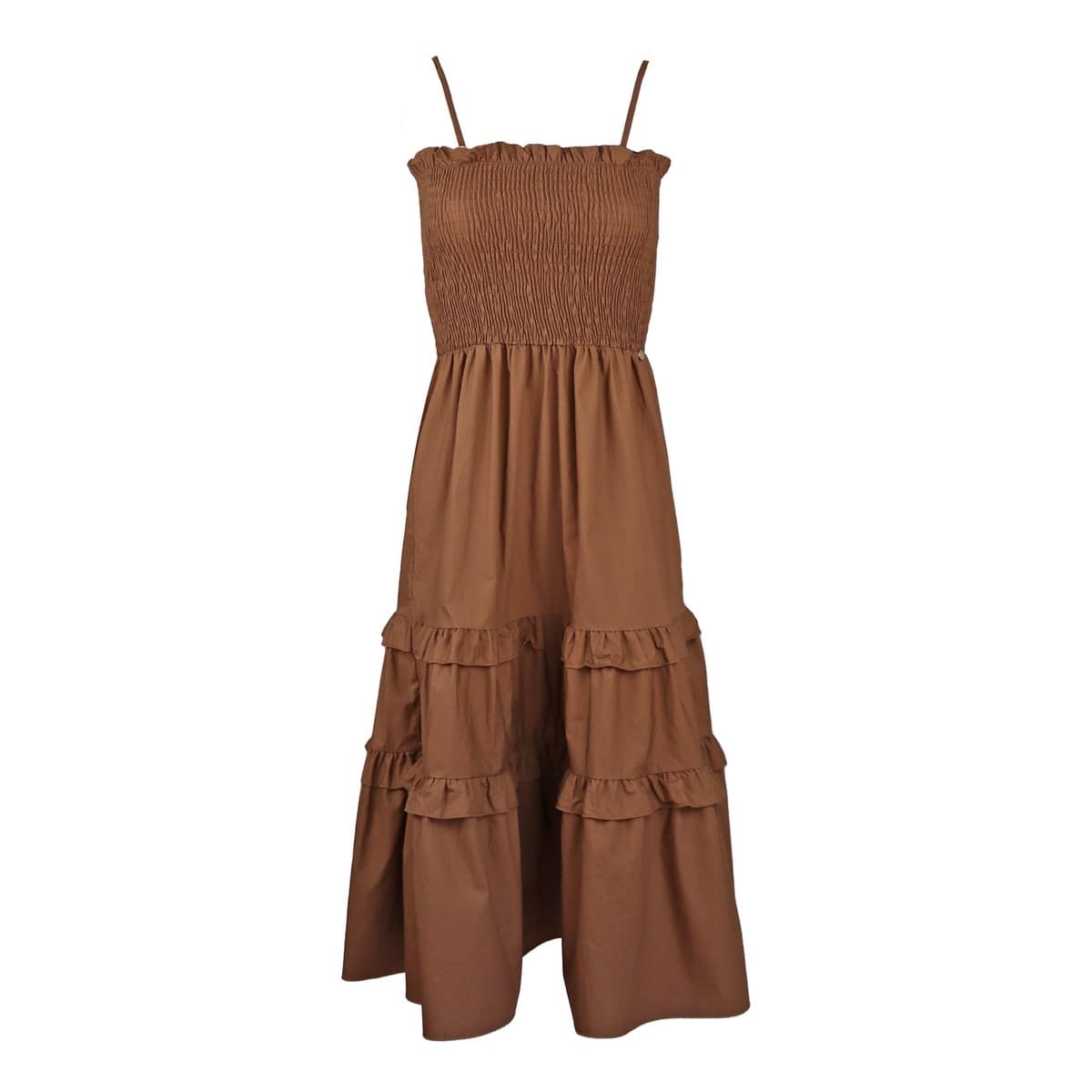 Lang kleedje van Verysimple. Deze midi jurk heeft een effen bruine kleur met stroken en een zwierige rok. De lange jurk heeft lintjes op de schouders, deze kun je in een elegante strik leggen, maar je kunt de jurk ook strapless dragen. Aan de bovenzijde heeft de jurk een elastische body.
