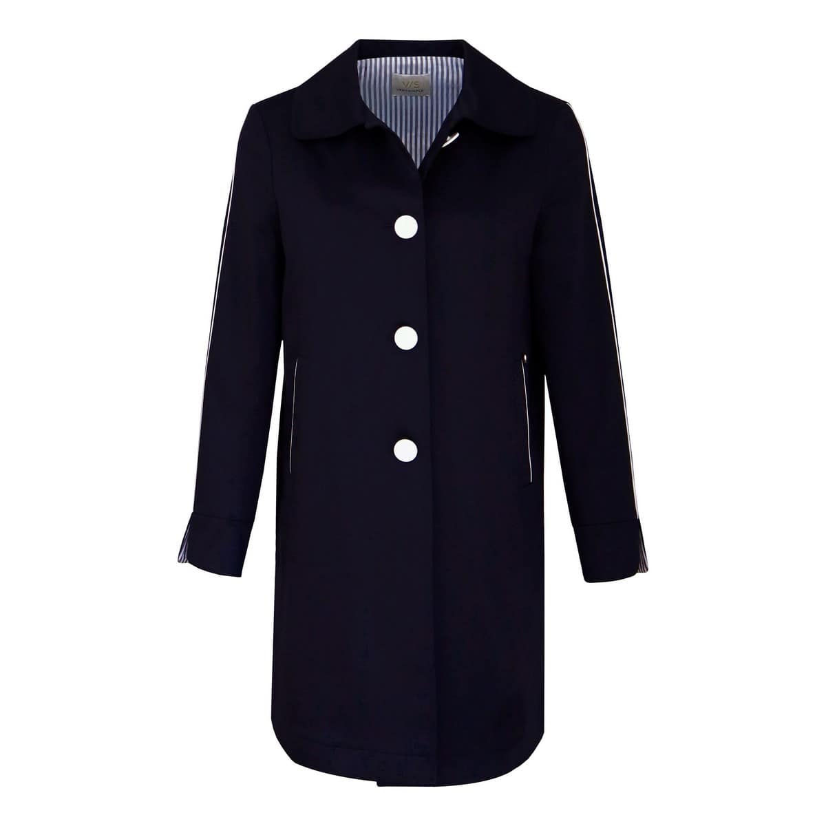 Donkerblauwe trenchcoat van Verysimple. Deze donkerblauwe lange jas is gemaakt van een katoenen stof met een touch of stretch. De jas sluit aan de voorzijde met vier grote witte knopen en heeft elegante witte biesjes aan de mouwen en de steekzakken.