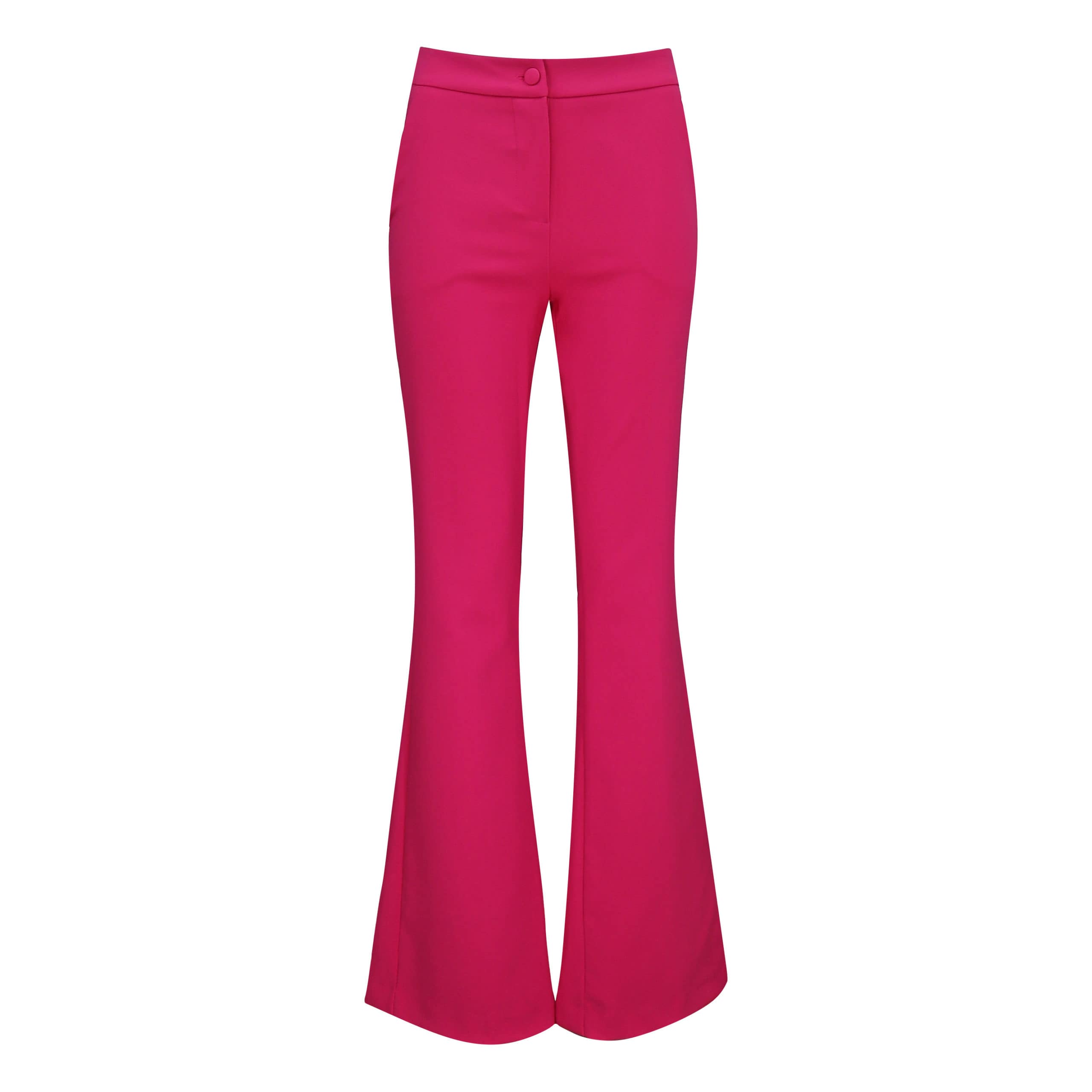 Bootcut pantalon van Verysimple in bouganville. Deze fuchsia broek heeft een hoge taille met flared broekspijpen. De pantalon sluit met een knoop- en ritssluiting en heeft twee steekzakken aan de voorzijde.