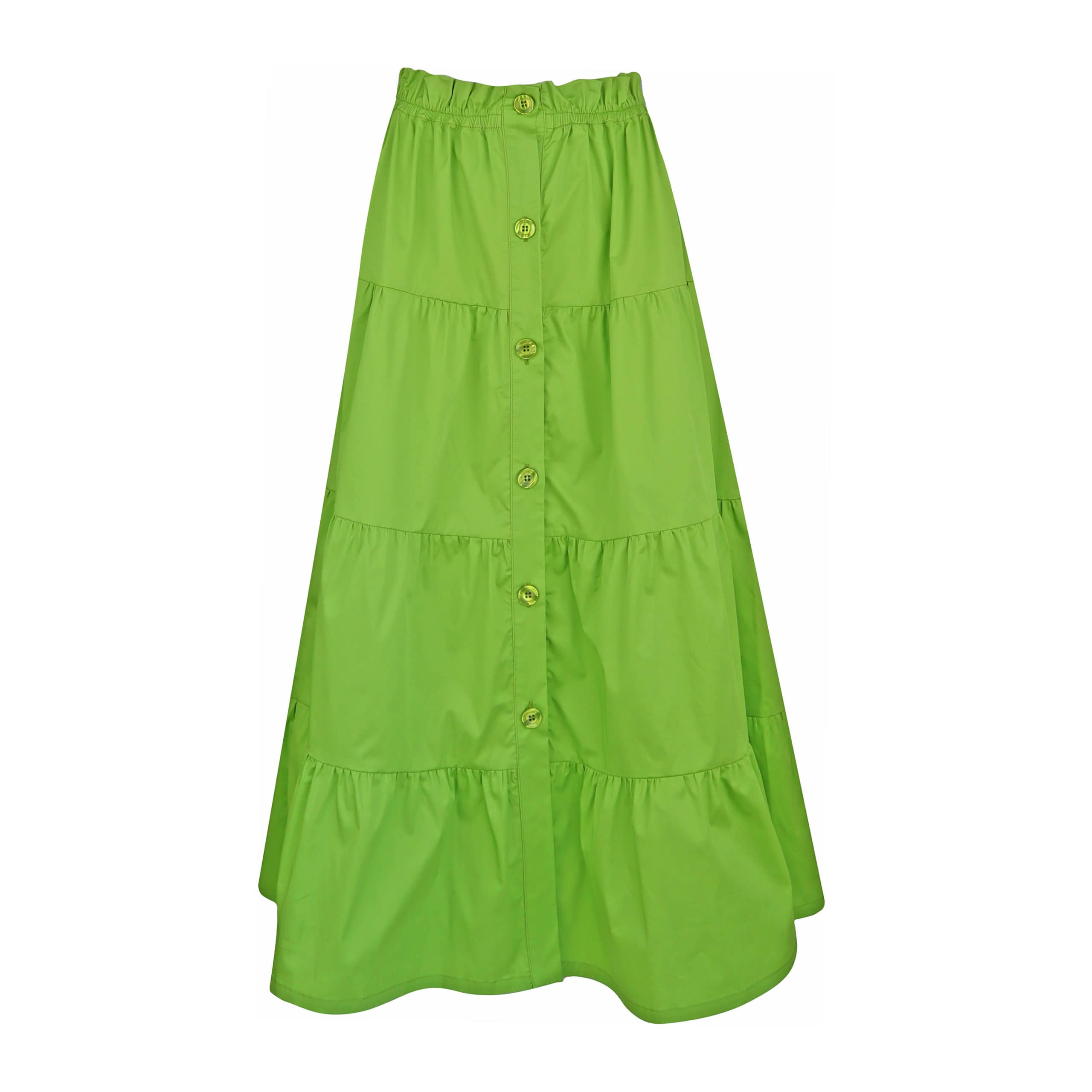 Groene maxi rok van Verysimple. Deze katoenen rok is gemaakt van een appeltjes groene stof en valt wijd. De rok heeft een elastische taille, sluit aan de voorzijde met groene knopen en is opgebouwd uit brede volants.
