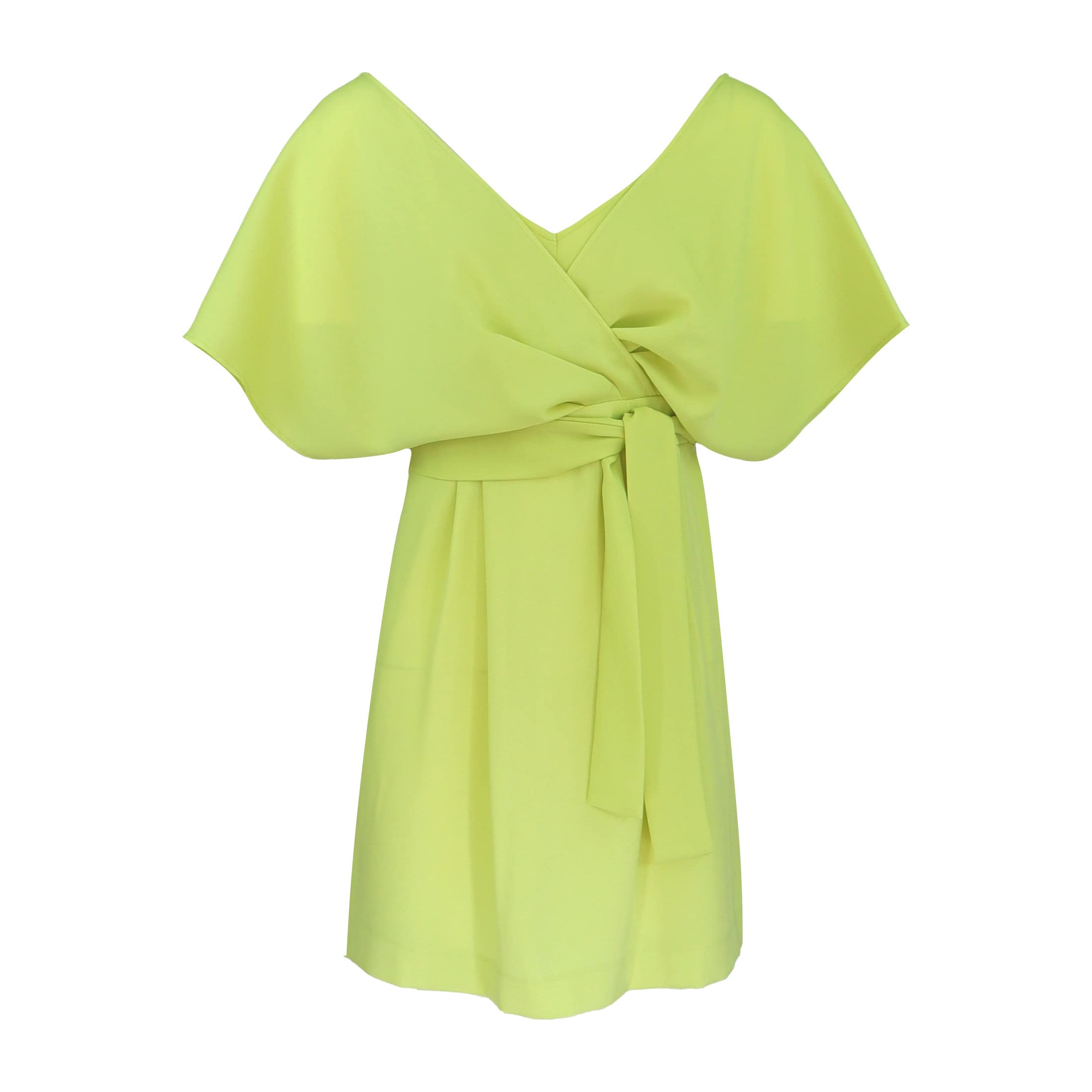 Mini kleedje van Verysimple. Deze korte jurk is gemaakt van een groen gele stof en sluit met een verborgen ritssluiting. De jurk heeft een verhoogde taille, losse mouwen die overgaan in een overslag aan de voorzijde met daaronder een top en een bijpassende ceintuur.
