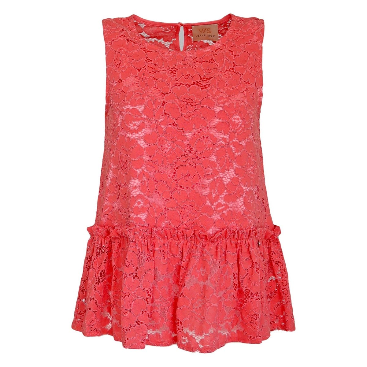 Kanten top van Verysimple. Deze top is mouwloos en is geheel gemaakt van kant. Aan de voorzijde is de kant van de top gevoerd. Aan de onderzijde heeft de top sierlijke volants voor een extra vrouwelijke touch.