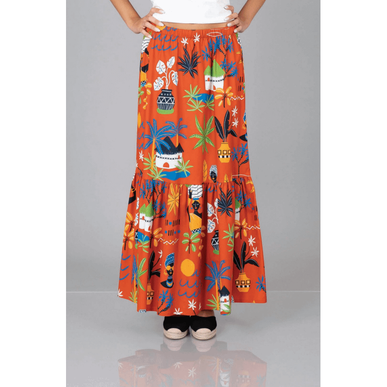 Maxi rok van Verysimple. Deze katoenen rok heeft een rood bruine basis met hierop Afrikaanse afbeeldingen. De rok heeft een elastische taille en een brede volant aan de zoom.