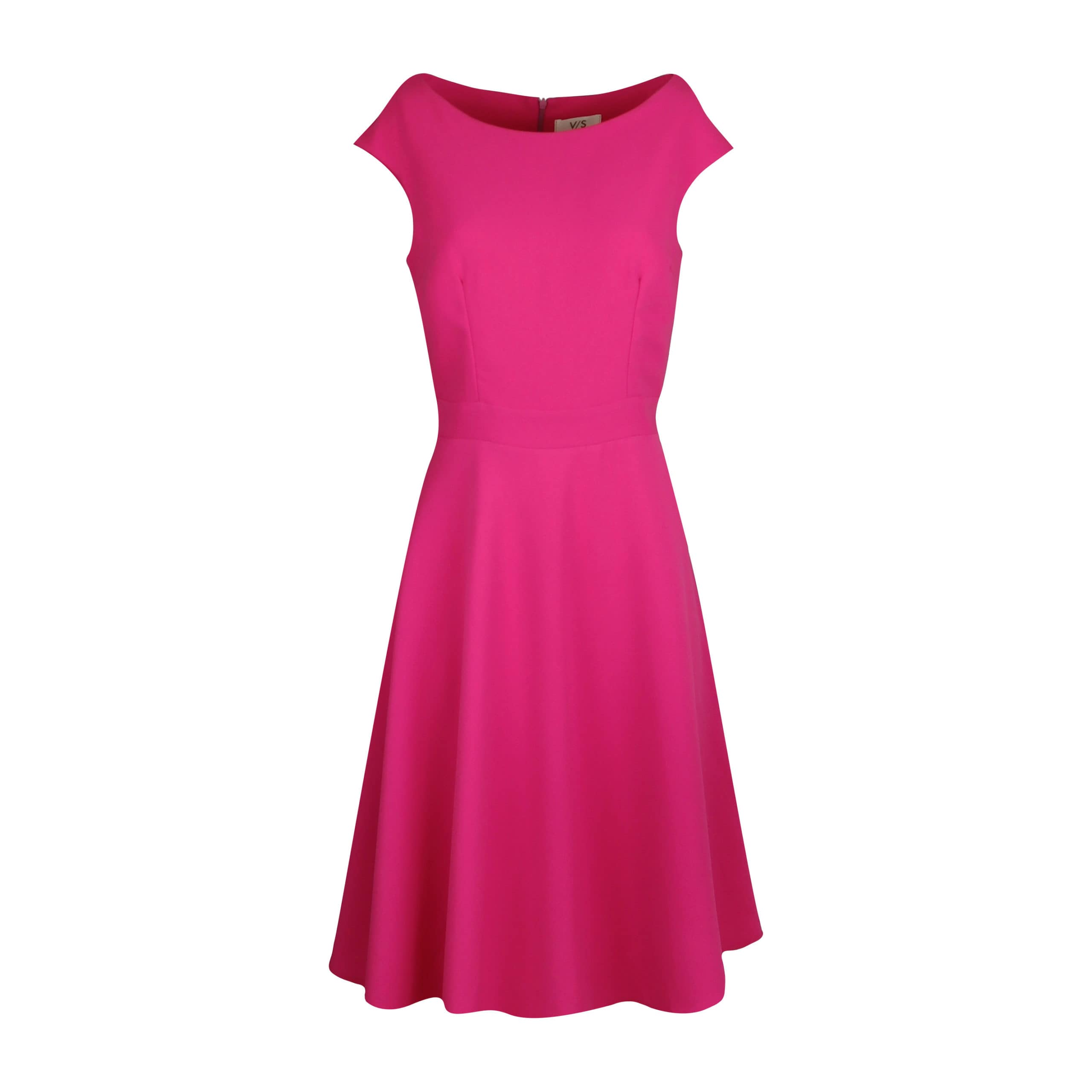 Mouwloos kleedje van Verysimple. Deze fuchsia jurk is getailleerd en heeft een wijde zwierige rok. De jurk sluit met een verborgen ritssluiting aan de achterkant, heeft een ronde hals en kapmouwen.