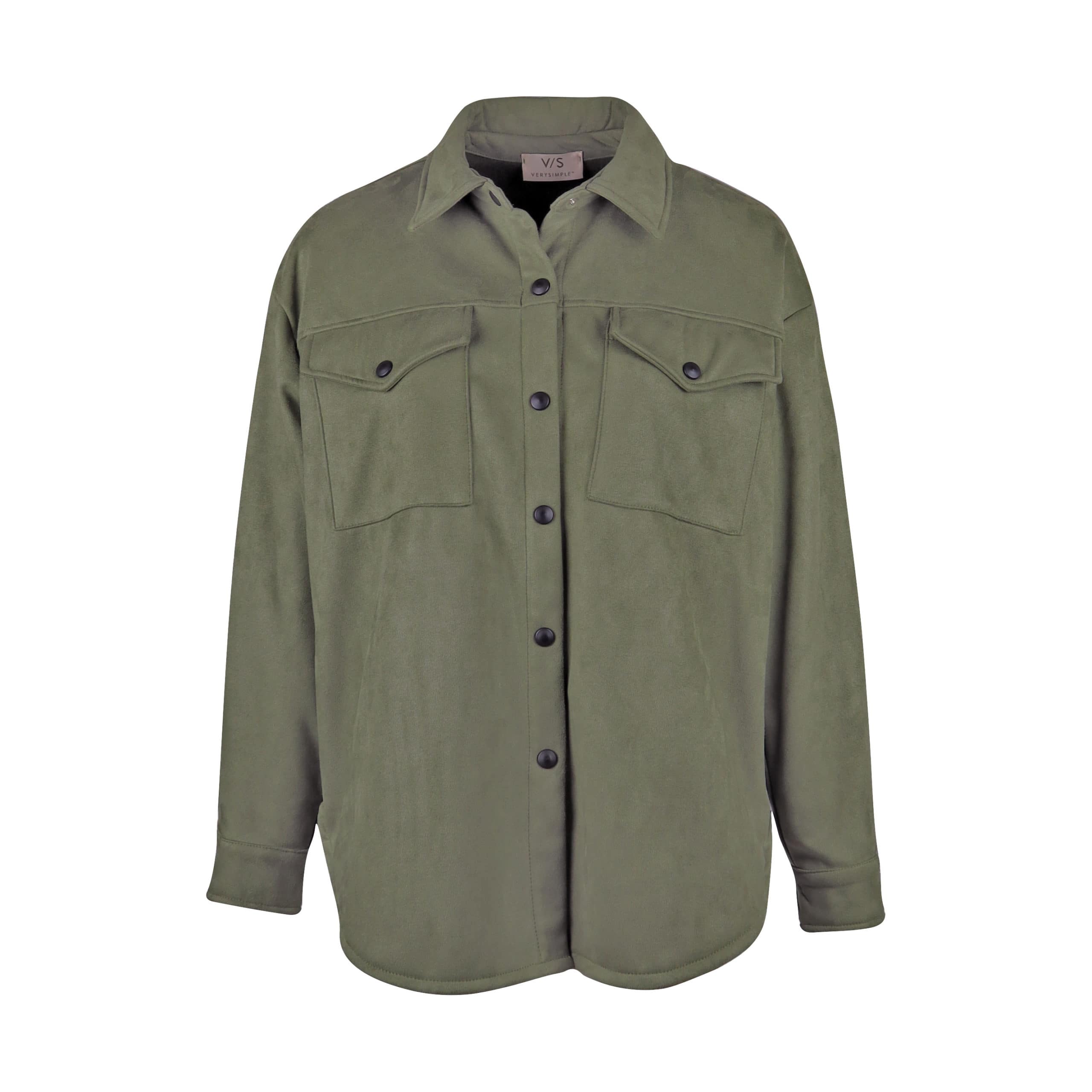 Oversized blouse van Verysimple. Deze blouse is gemaakt van zachte, dikke kaki groene sweaterstof met een suède look. De blouse sluit aan de voorzijde met drukknopen en heeft twee borstzakken aan de voorzijde.