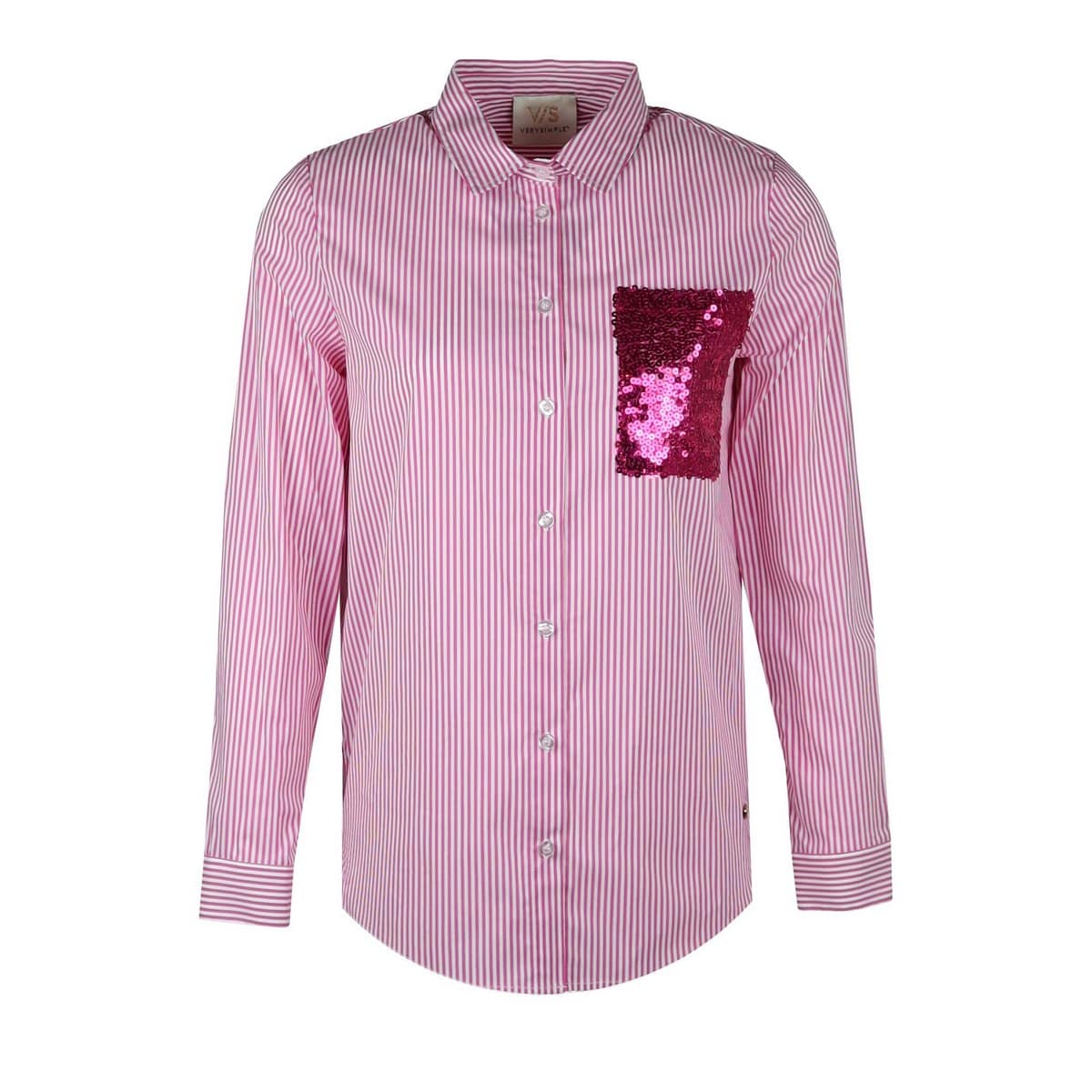 Roze gestreepte blouse van Verysimple. De pasvorm van deze blouse is losvallend en sluit aan de voorzijde met een knoopsluiting. De blouse heeft een ronde zoom en borstzakje dat bezet is met roze pailletten.