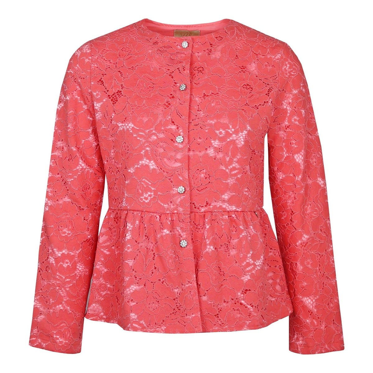 Roze kanten jasje van Verysimple in coral. Dit jasje is gevoerd en gemaakt van een opengewerkte geborduurde stof met een bloemen patroon. Het jasje sluit aan de voorzijde met kleine bloem knoopjes en heeft een elegante volant.
