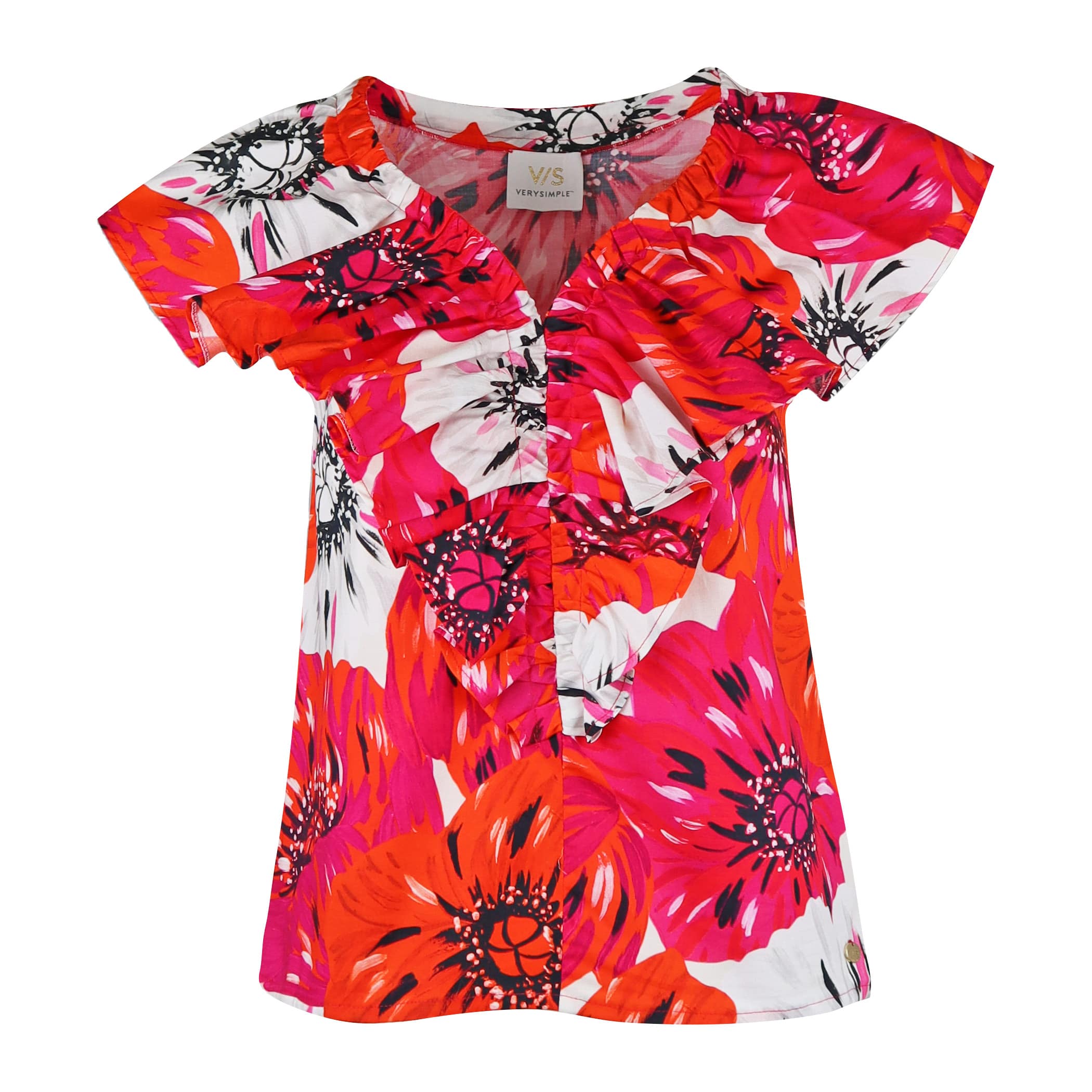 Fleurige top van Verysimple. Deze top heeft een oranje, wit met fuchsia roze print, loopt iets uit en is mouwloos. De top heeft bij de hals en borst grote elegante ruches.