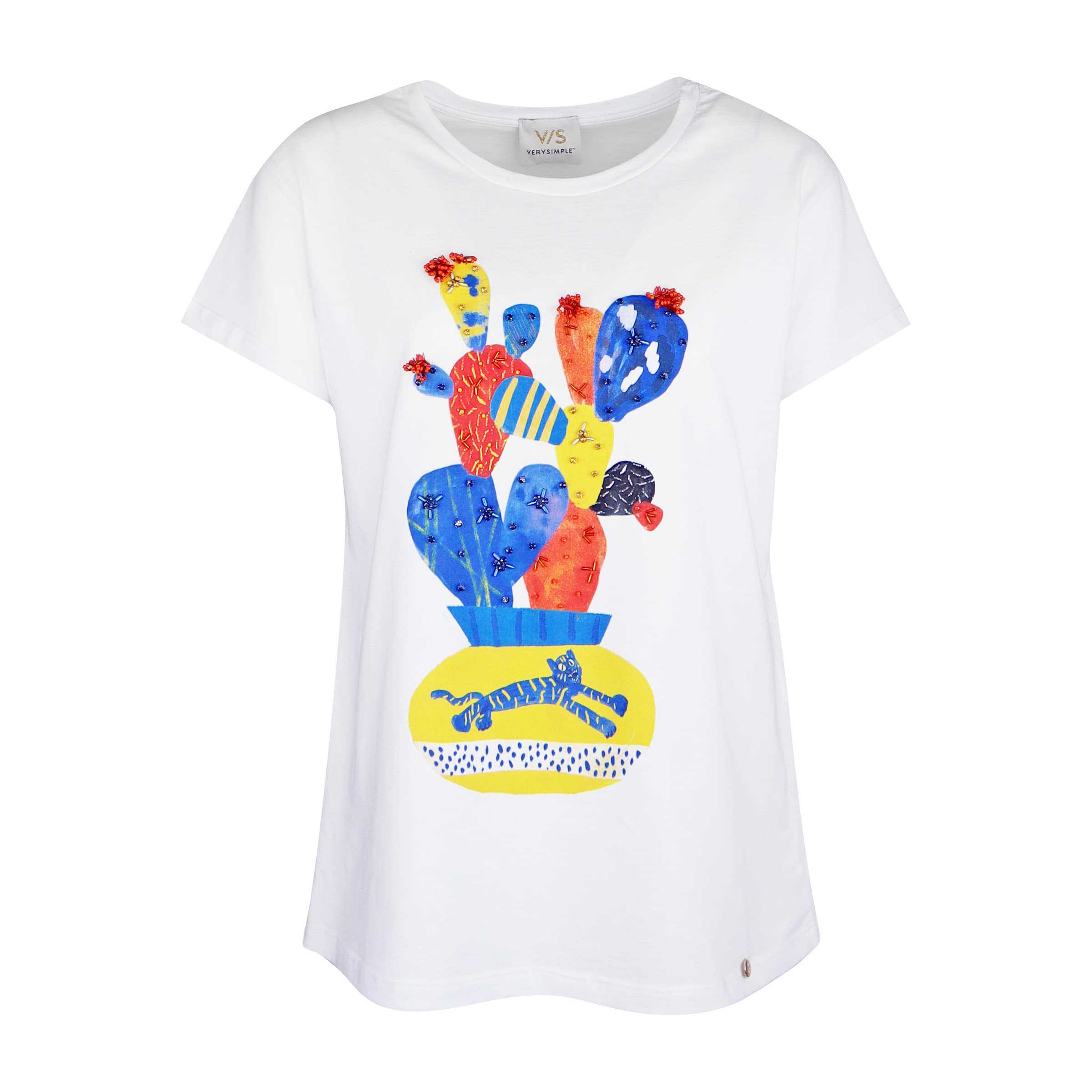 Wit oversized t-shirt van Verysimple. Dit katoenen shirt heeft korte mouwen en een ronde hals. Aan de voorzijde staat een afbeelding van een blauw kat met daarboven een cactus in blauw, rood en geel. De afbeelding is versiert met kralen.