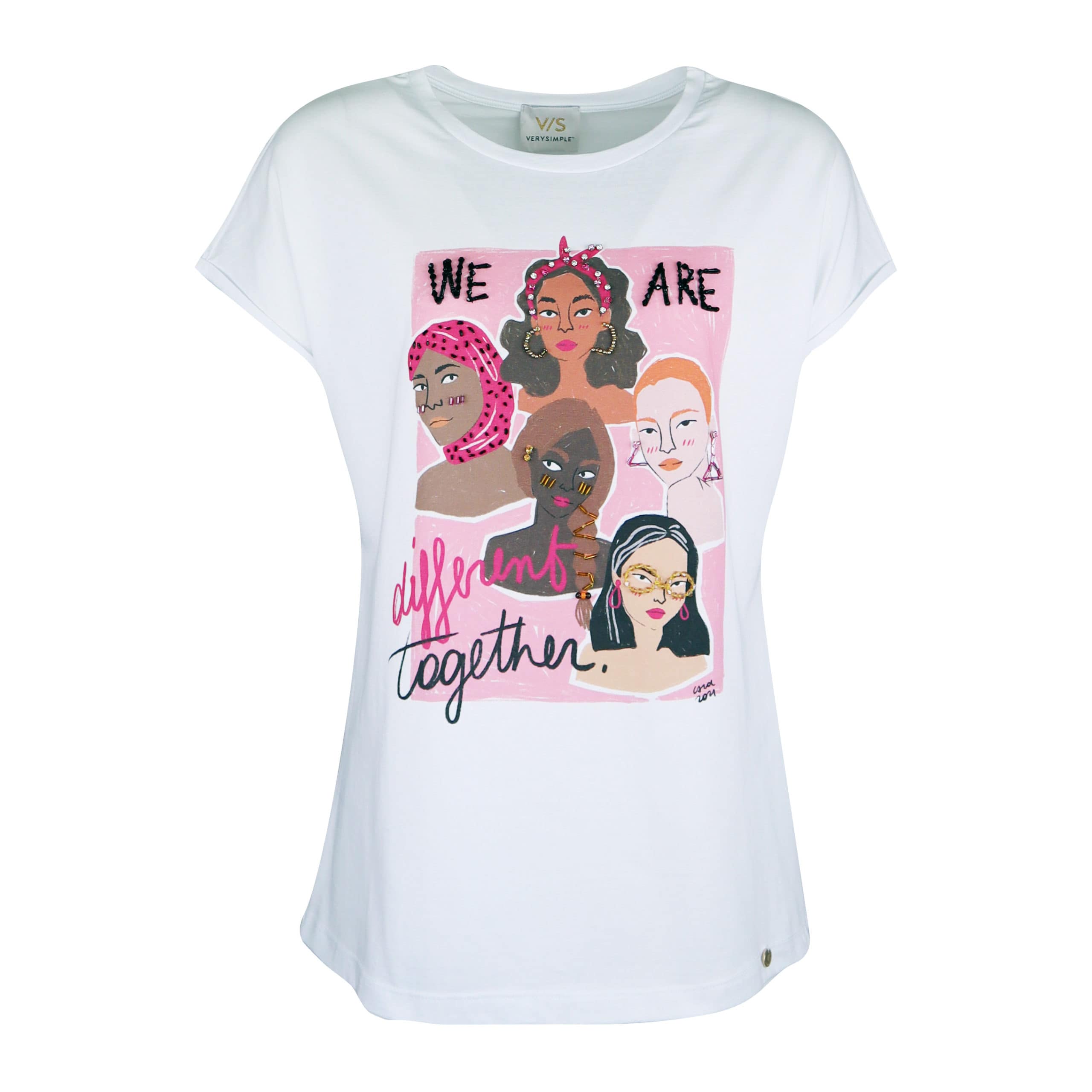 Wit oversized t-shirt van Verysimple. Dit katoenen shirt heeft korte vleermuis mouwen en een ronde hals. Aan de voorzijde staat een afbeelding van diverse vrouwen met de tekst we are different together. De afbeeldingen zijn versiert met kralen.