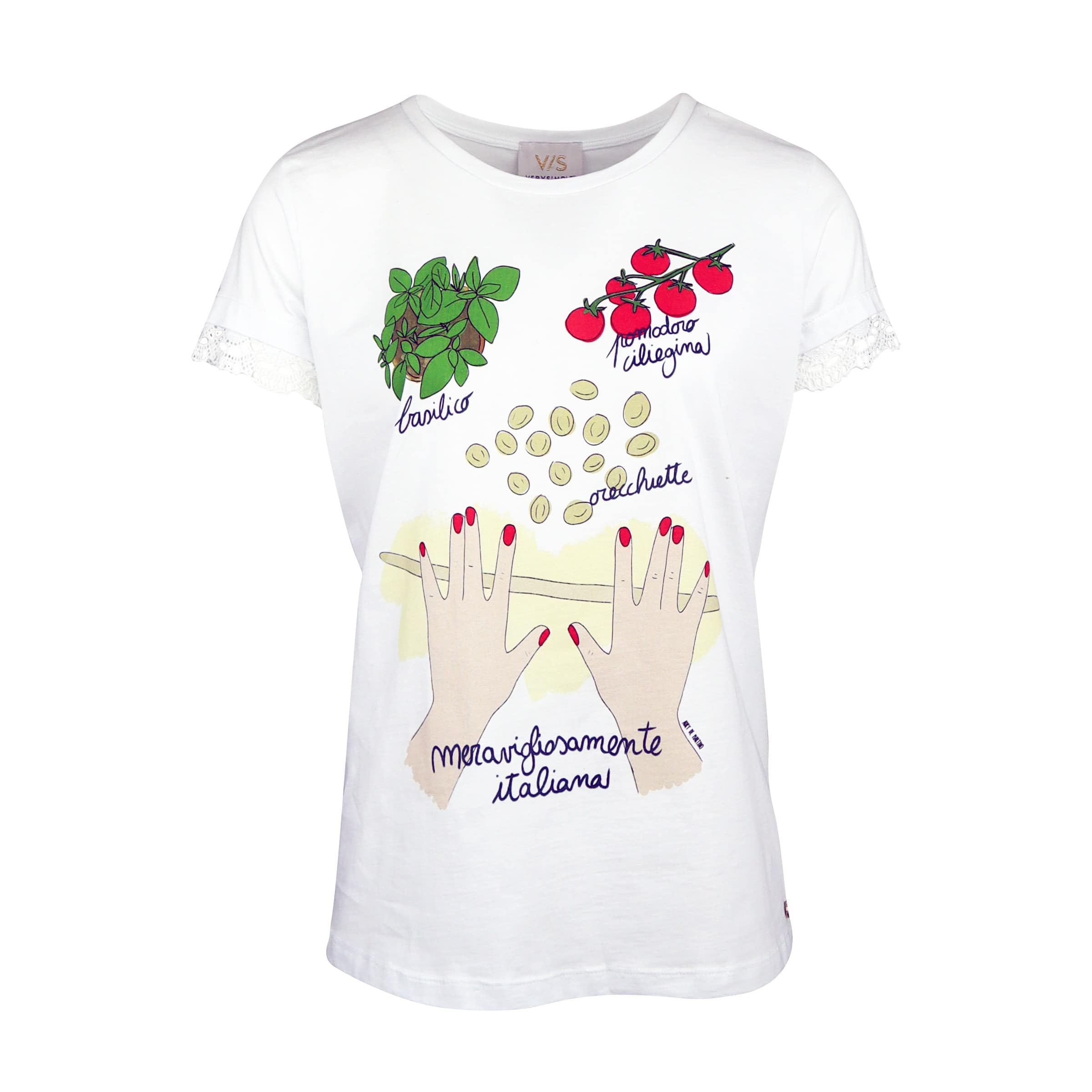 Wit uitlopend t-shirt van Verysimple. Dit katoenen shirt heeft korte mouwen met een kanten rand en een ronde hals. Aan de voorzijde staat een afbeelding van tomaten, basilicum en pasta.