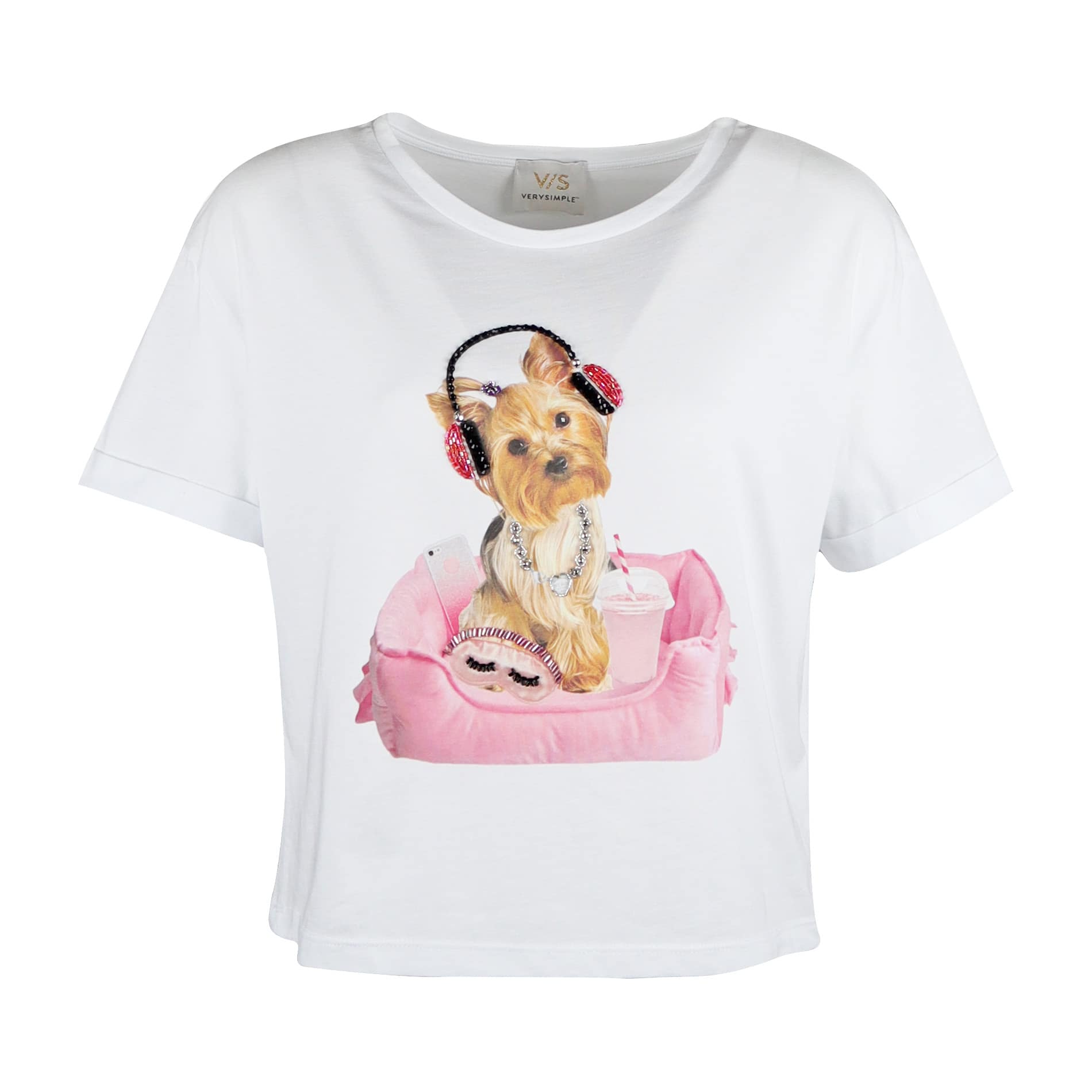 Wit kort t-shirt van Verysimple met de tekening van een hond. Dit katoenen t-shirt heeft een ronde hals en korte mouwen. Op de voorzijde staat een afbeelding van een hond met een headset en deze is versierd met kralen.