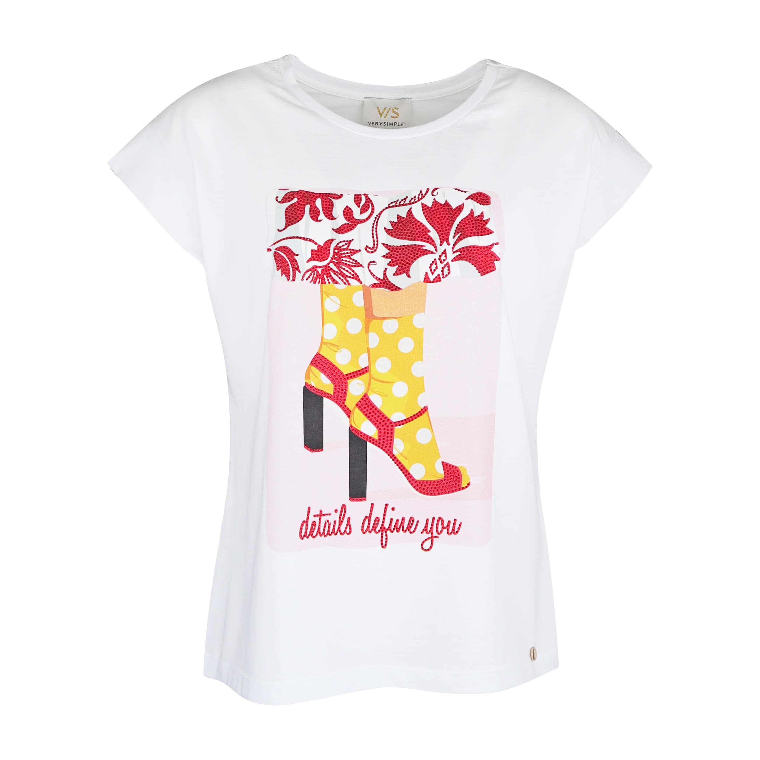 Wit t-shirt van Verysimple. Dit shirt heeft korte vleermuis mouwen en een ronde hals. Aan de voorzijde staat een afbeelding van een sandaal en de tekst details define you. Alle rode vlakken zijn versiert met rode kralen.