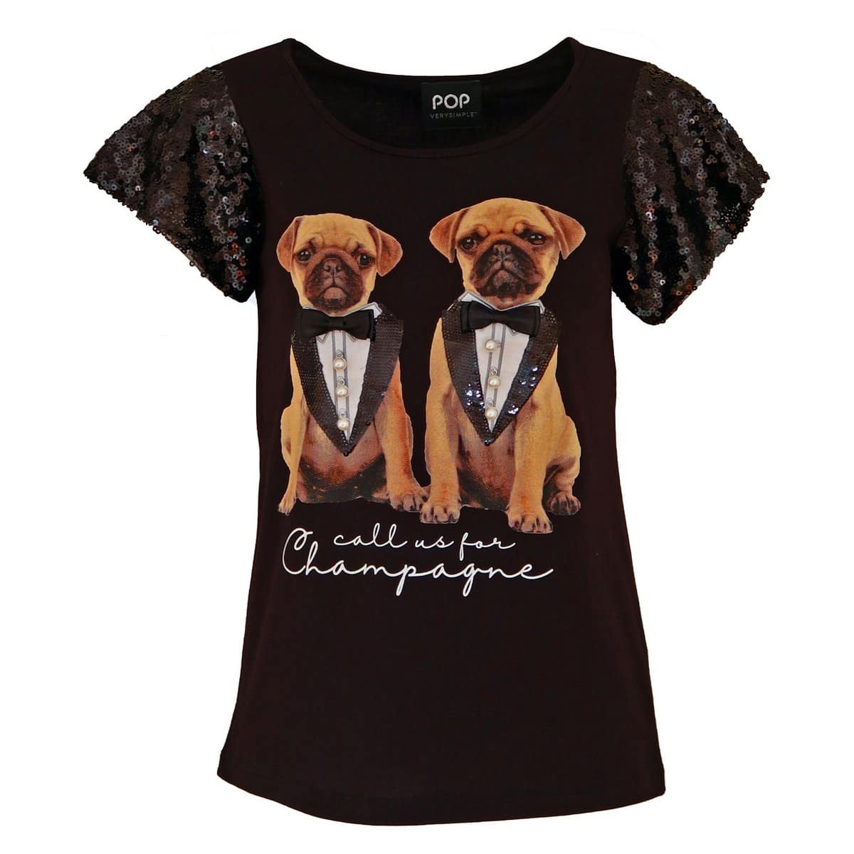 Zwart T-shirt van Verysimple. Dit shirt heeft korte mouwen die bezet zijn met zwarte pailletten en een ronde hals. Aan de voorzijde staat een afbeelding van twee honden met de tekst call us for champagne. Deze honden hebben een butler outfit aan, die gemaakt is met zwarte pailletten, sierparels en een strikje.