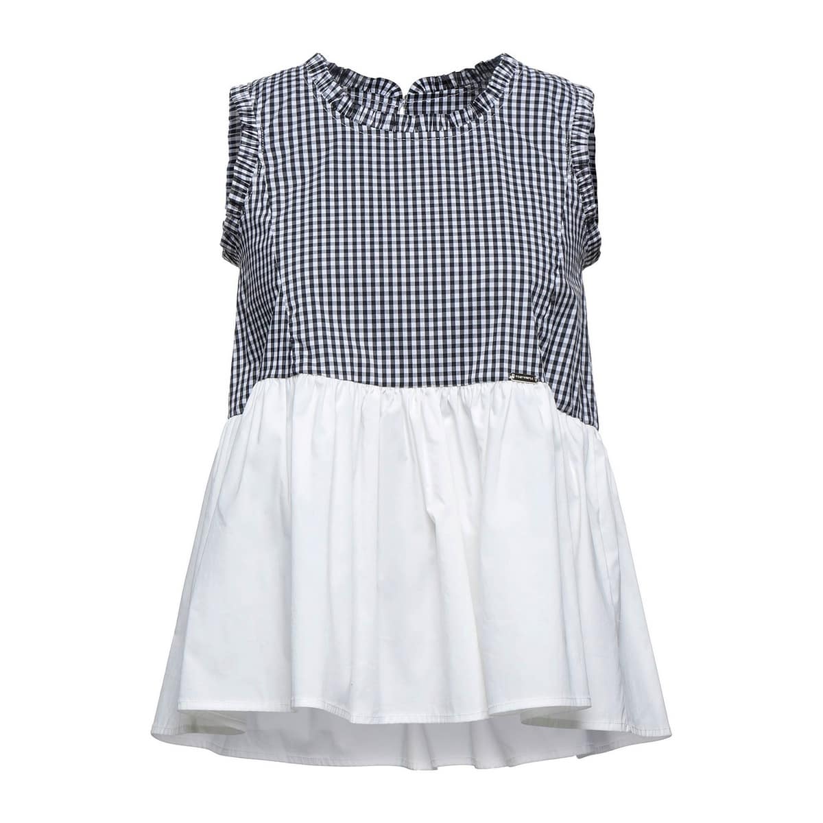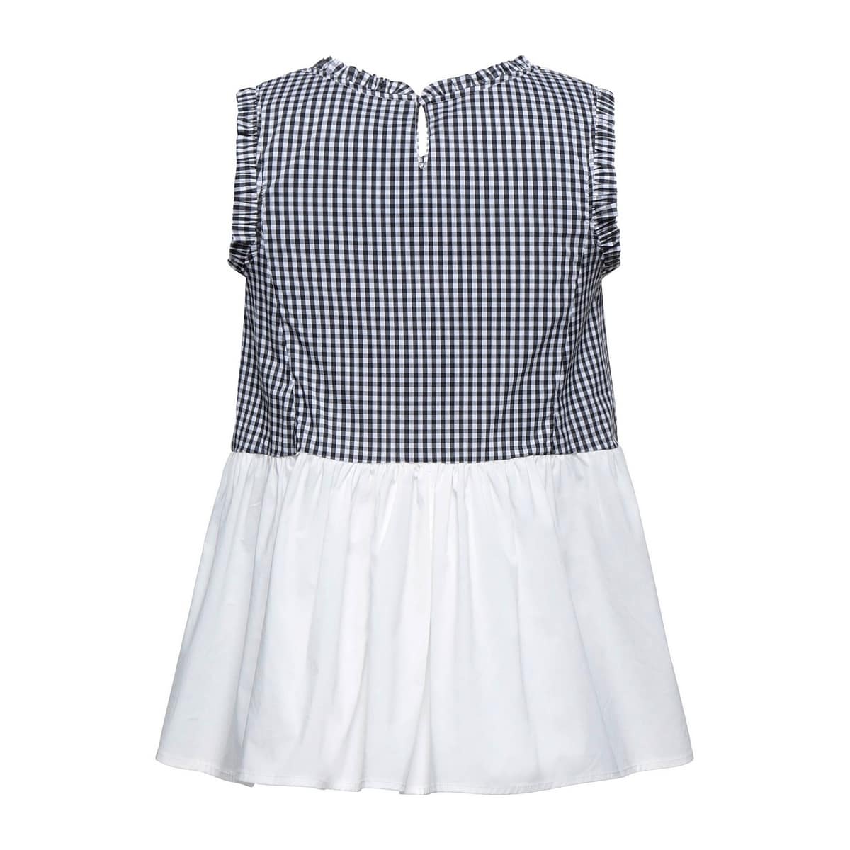 Zwart wit geblokte top van Verysimple. Deze mouwloze top heeft een zwart wit geblokte body met een wijdvallende volant. Aan de armsgaten en hals is de top afgezet met kleine volants in dezelfde stof. De top sluit aan de achterzijde met een klein knoopje.