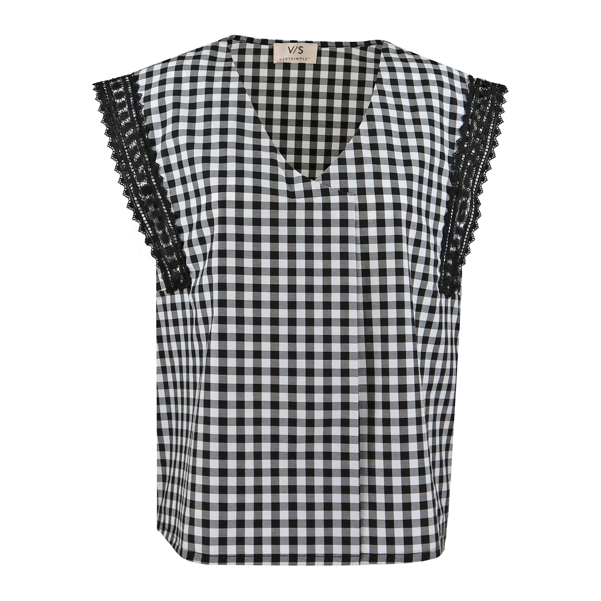 Zwart wit geblokte top van Verysimple. Deze mouwloze top is gemaakt van een katoenen stof en heeft een losvallende pasvorm. De top heeft aan de voorzijde een plooi en de armsgaten zijn afgewerkt met zwart kant.