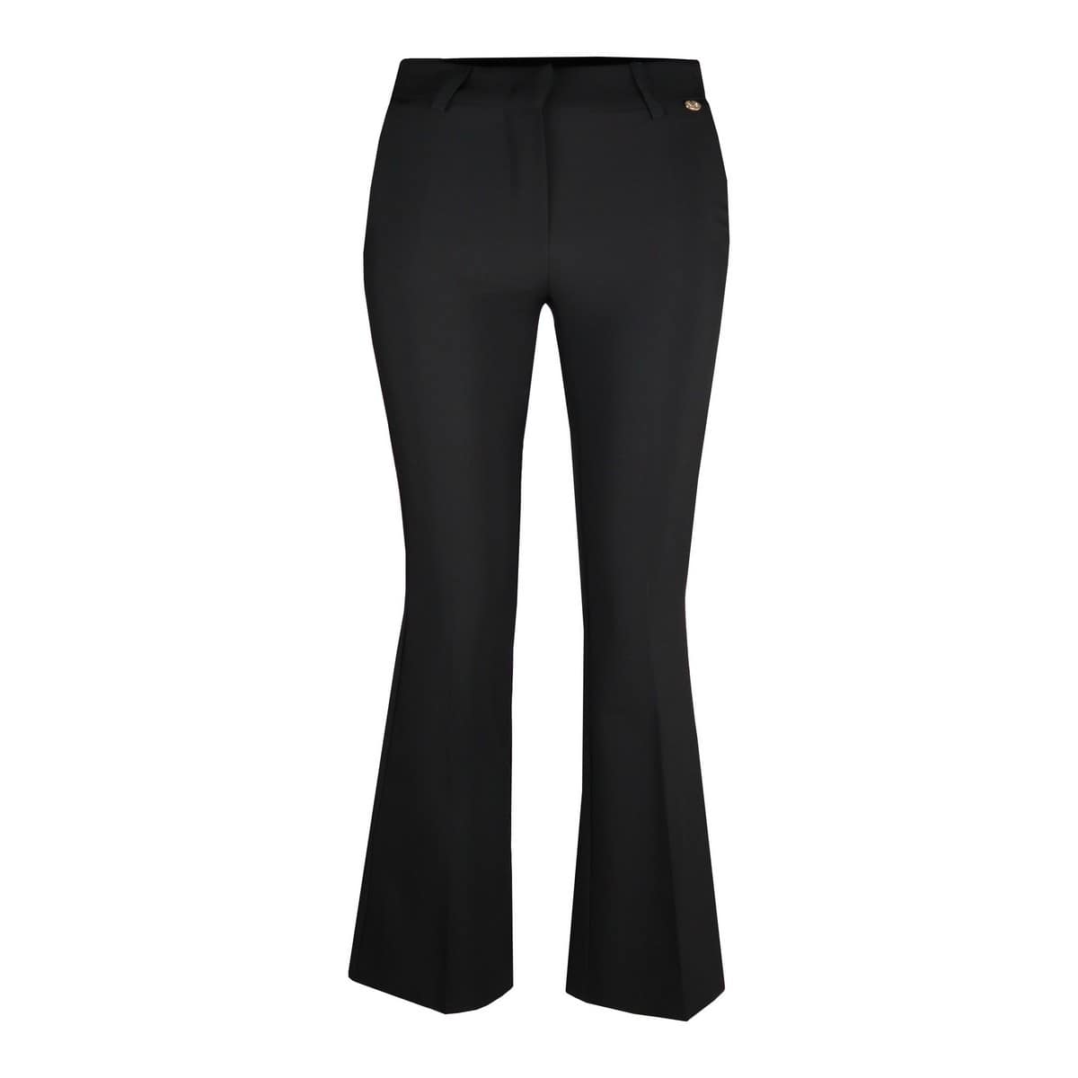 Klassieke pantalon van Verysimple. Deze zwarte broek heeft een flared pasvorm. De pantalon sluit met haakjes, knoop- en ritssluiting en heeft twee steekzakken aan de voorzijde.