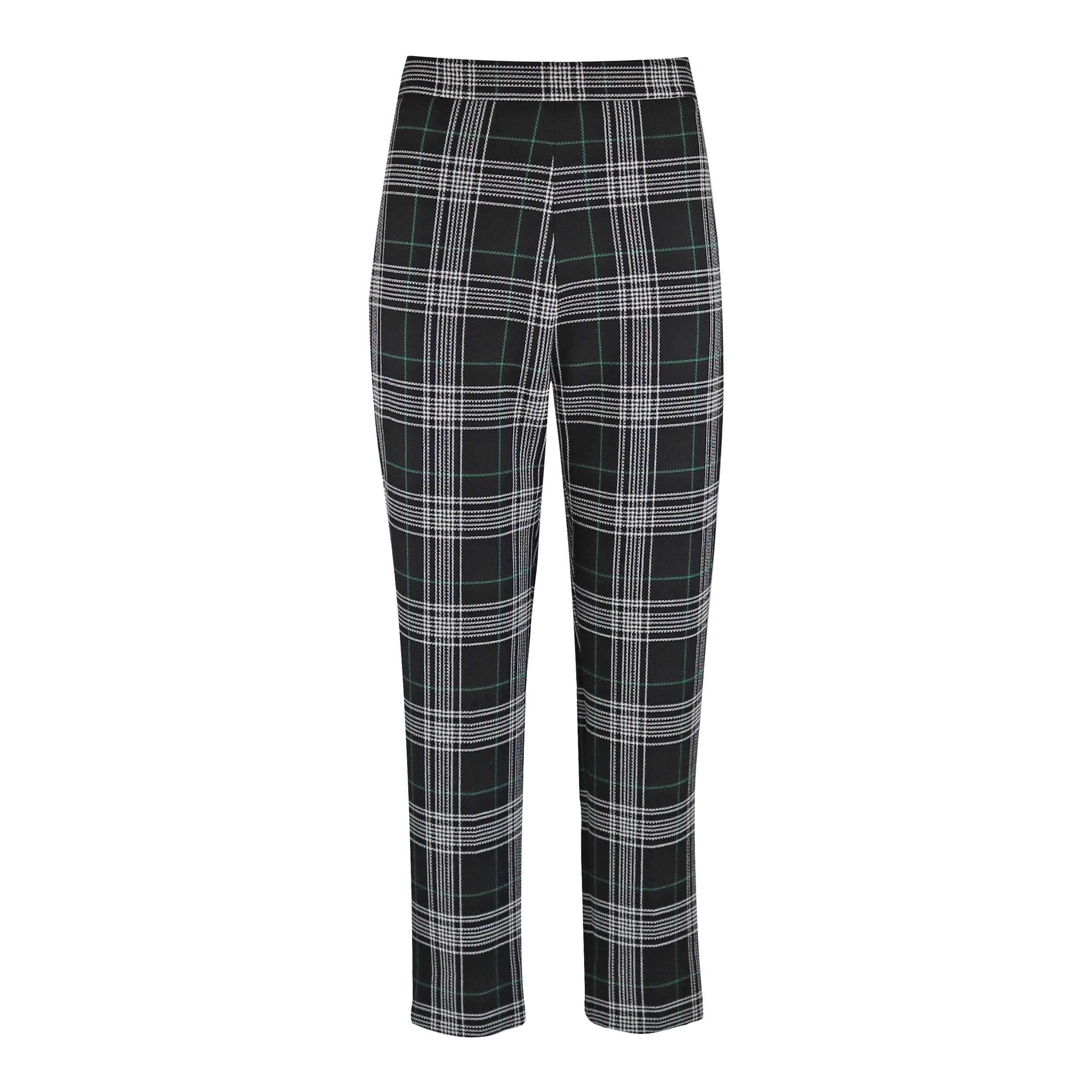 Zwarte geruite pantalon van Verysimple. Deze cropped pantalon is gemaakt van een zwart, wit en groen geruite stof en heeft een hoge taille. De broek valt net boven de enkels, heeft toelopende broekspijpen met aan de onderzijde een klein splitje en sluit met een verborgen ritssluiting aan de zijkant.