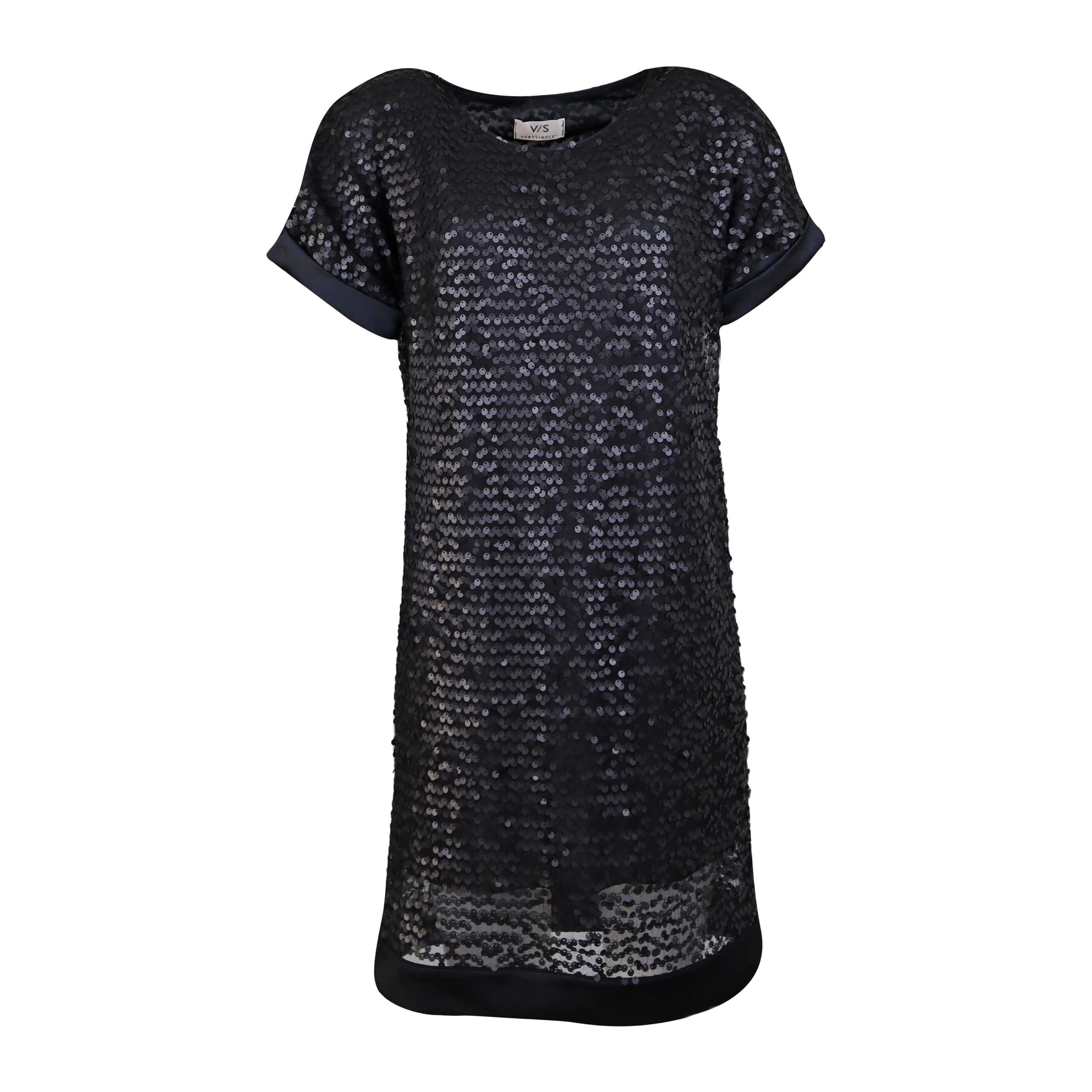 Zwart kleedje van Verysimple. Deze korte jurk is gevoerd en heeft een zwarte doorschijnende bovenlaag met zwarte pailletten. De jurk heeft een ronde hals en een zwarte satijnen afwerking aan de korte mouwen en zoom.