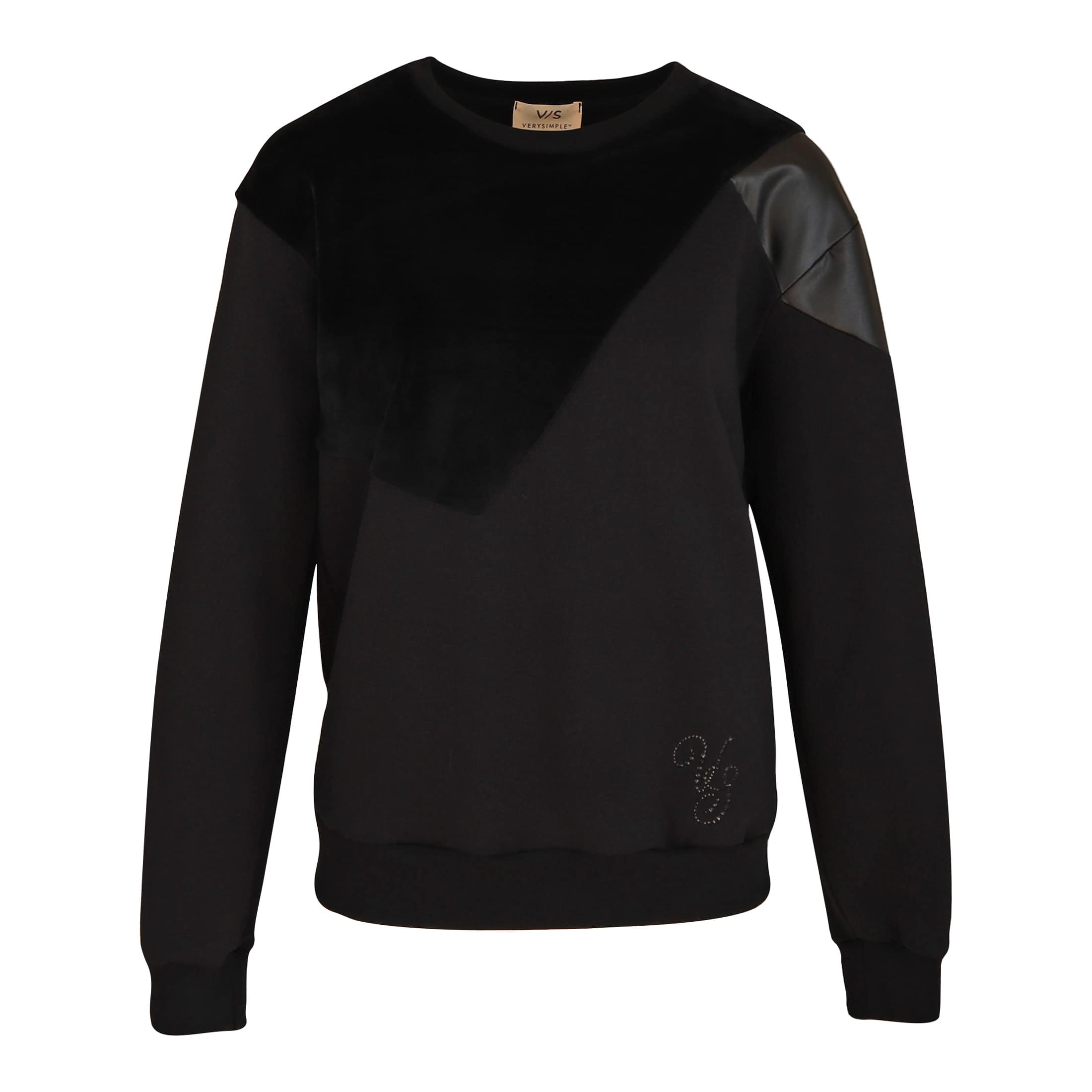 Zwarte pull van Verysimple. Deze sweater is gemaakt van katoen en heeft een los vallende pasvorm. De trui heeft een ronde hals, een fluweel zwart vlak en een leerlook vlak en een effen achterzijde met lange mouwen.