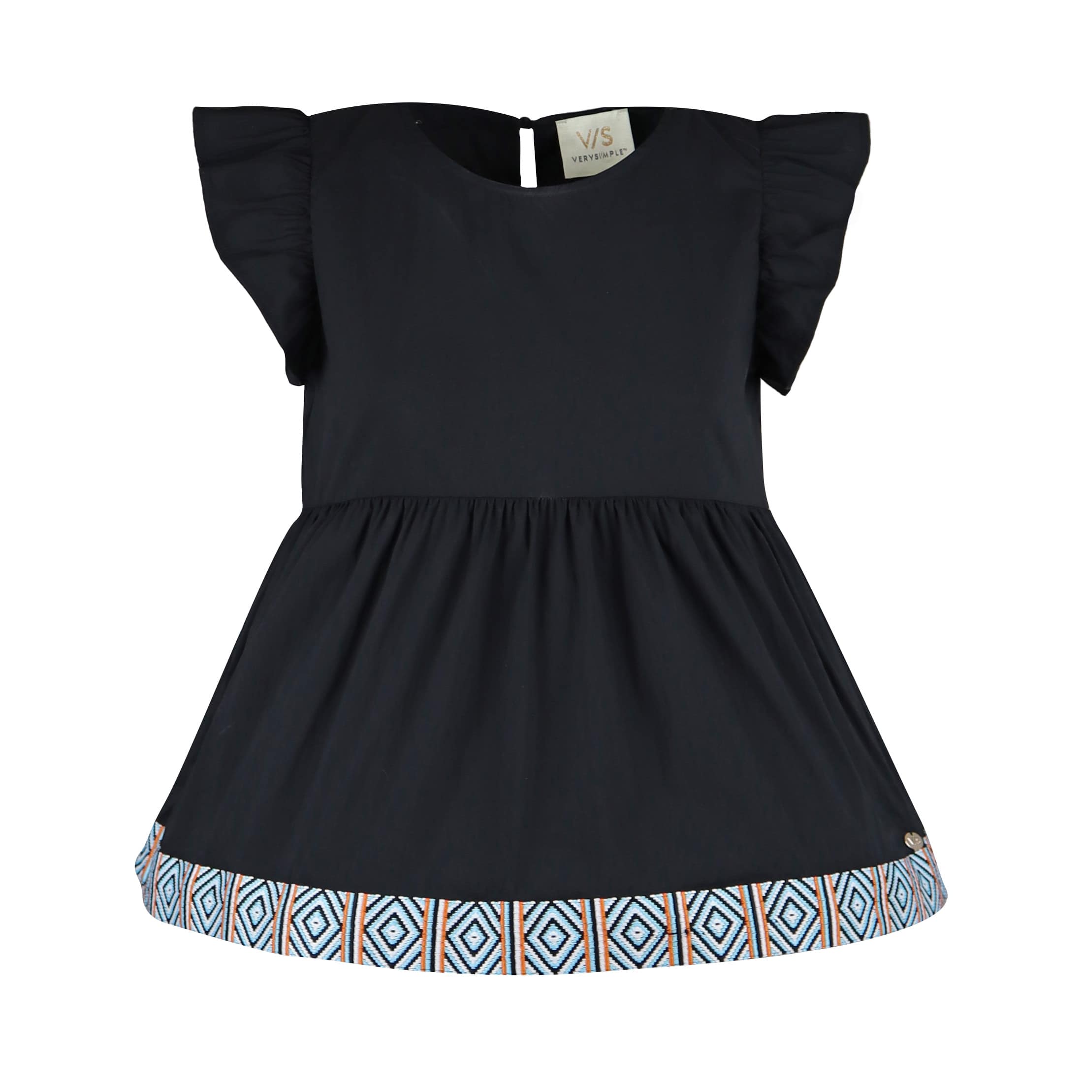 Zwarte top van Verysimple. Deze top is gemaakt van een katoen mix met stretch en heeft aan de onderzijde een geborduurde zoom. De top heeft een ruim vallende pasvorm met een elegante volant aan de onderzijde.