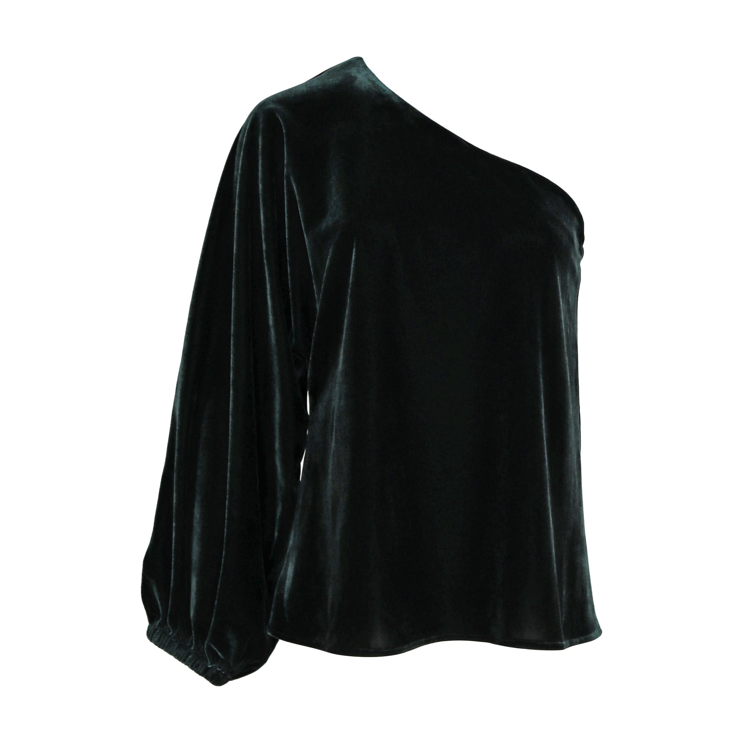 Groene velvet pull van YMRA. Deze trui is gemaakt van een groene fluwelen stretch stof en heeft een losse pasvorm. De trui heeft aan een zijde een open schouder en aan de andere zijde een wijde lange mouw.