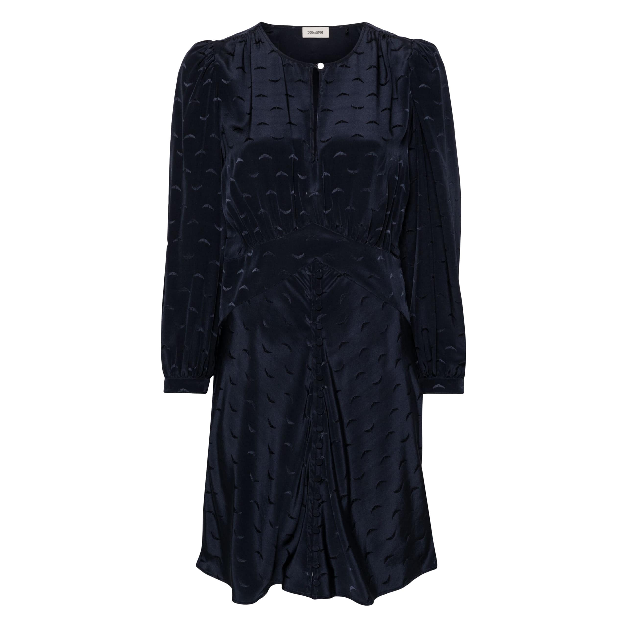 Donkerblauw zijden kleedje van Zadig & Voltaire, model Rhodri jac wings in encre. Deze jurk is gemaakt van 100% zijde met donkerblauwe wings die in de stof verweven zijn. De jurk sluit met een knoopsluiting aan de voorzijde. De rok heeft aan de voorzijde kleine donkerblauwe knoopjes en valt op je bovenbeen.