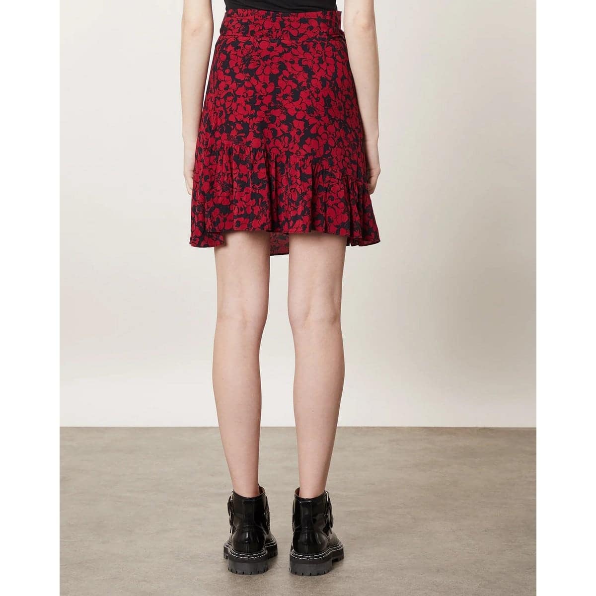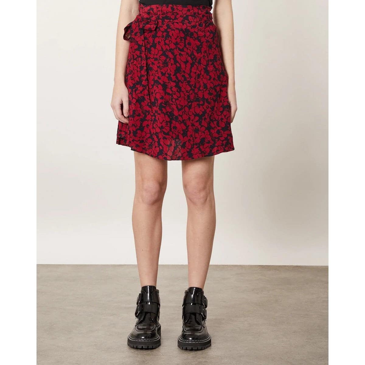 Rode overslag rok van Zadig & Voltaire, model Jusso Bico flowers. Deze korte rok heeft een zwarte basis met een all over print van bordeaux rode bloemen. De korte rok sluit met linten in de taille die je aan de zijkant kunt strikken.