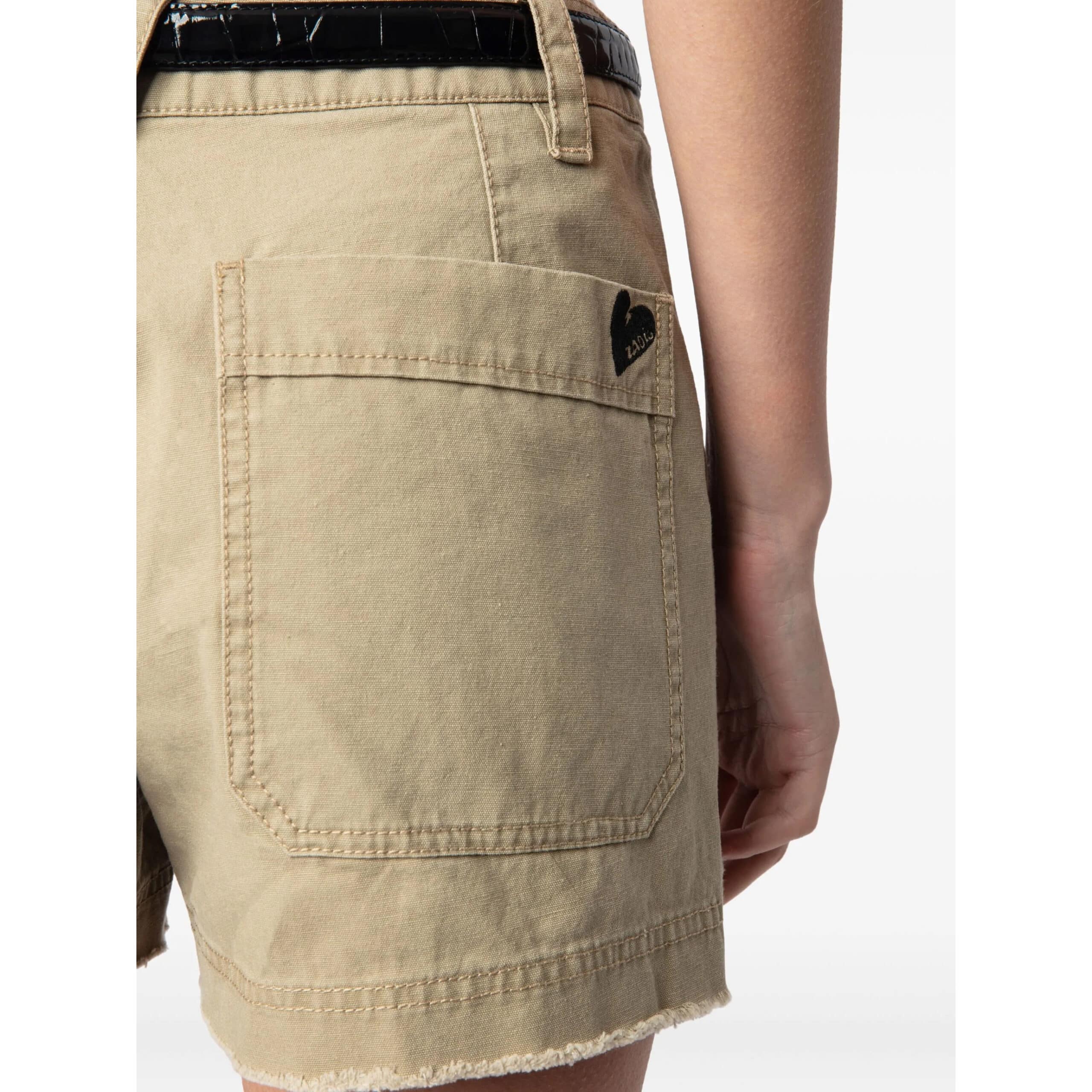 Bruine short van Zadig & Voltaire, model sparky coton lave in latte. Deze korte broek is gemaakt van een organische katoenen stof stof, heeft een normale pasvorm en een fijn gerafelde zoom. De short sluit met een knoop- en ritssluiting, heeft twee steekzakken en twee achterzakken waarvan er één een zwart Zadig hartje heeft.