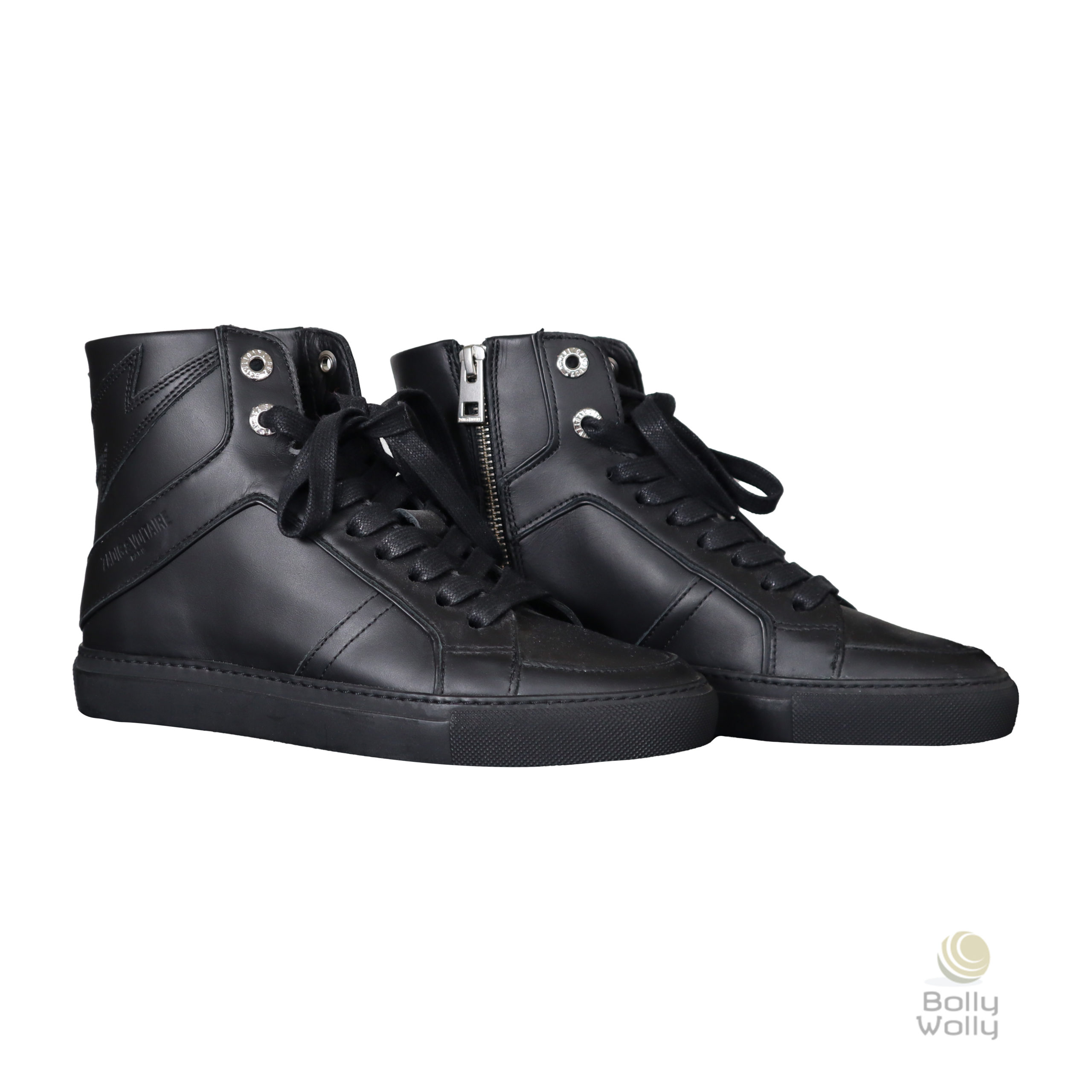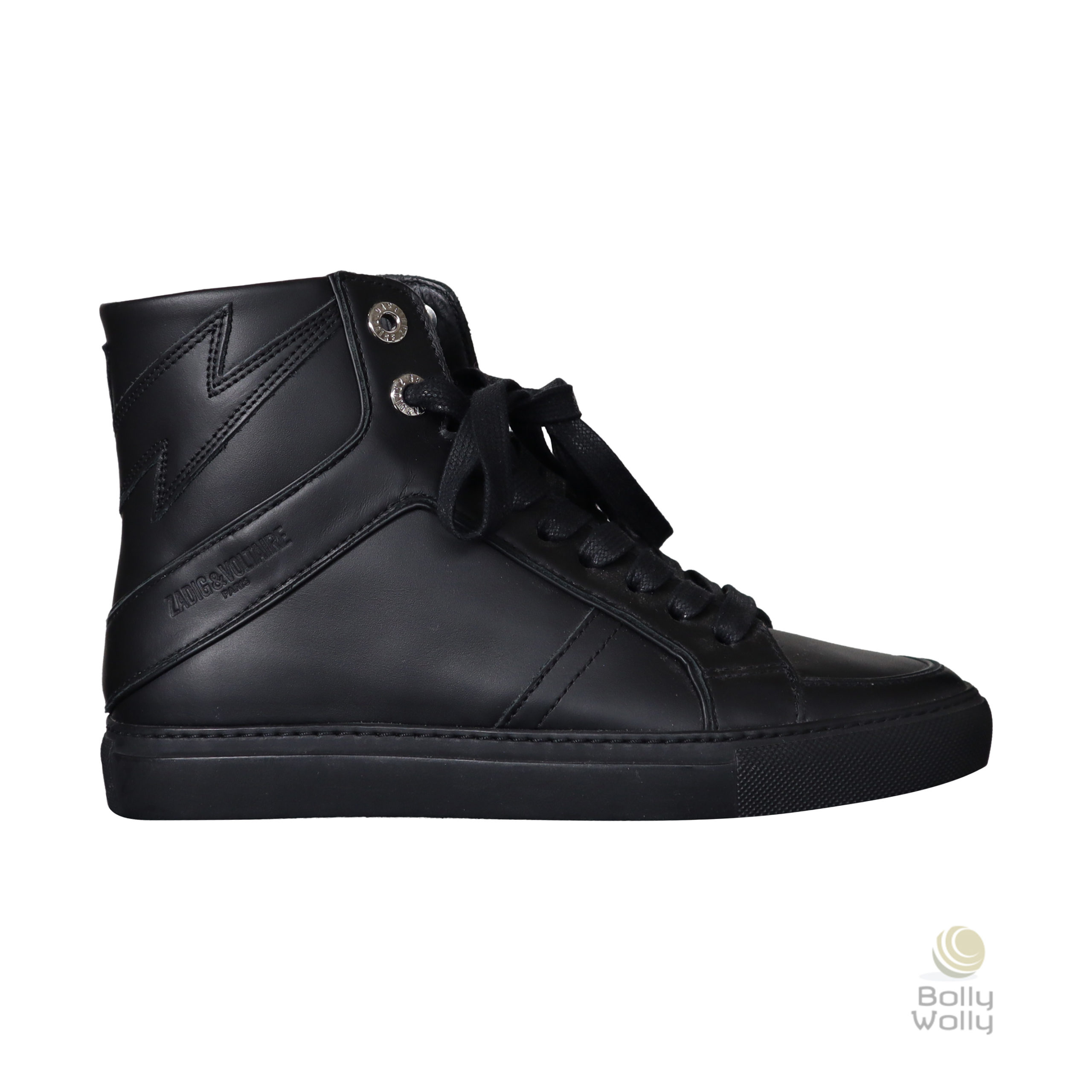 Zwarte hoge sneakers van Zadig & Voltaire, model ZV1747 high flash smooth. Deze sneakers zijn gemaakt van kalfsleer en heeft een hoge pasvorm. De kenmerkende bliksemschicht staat op de achter- en zijkant met daaronder in reliëf het Zadig & Voltaire logo.
